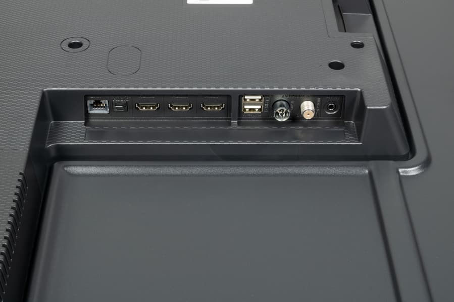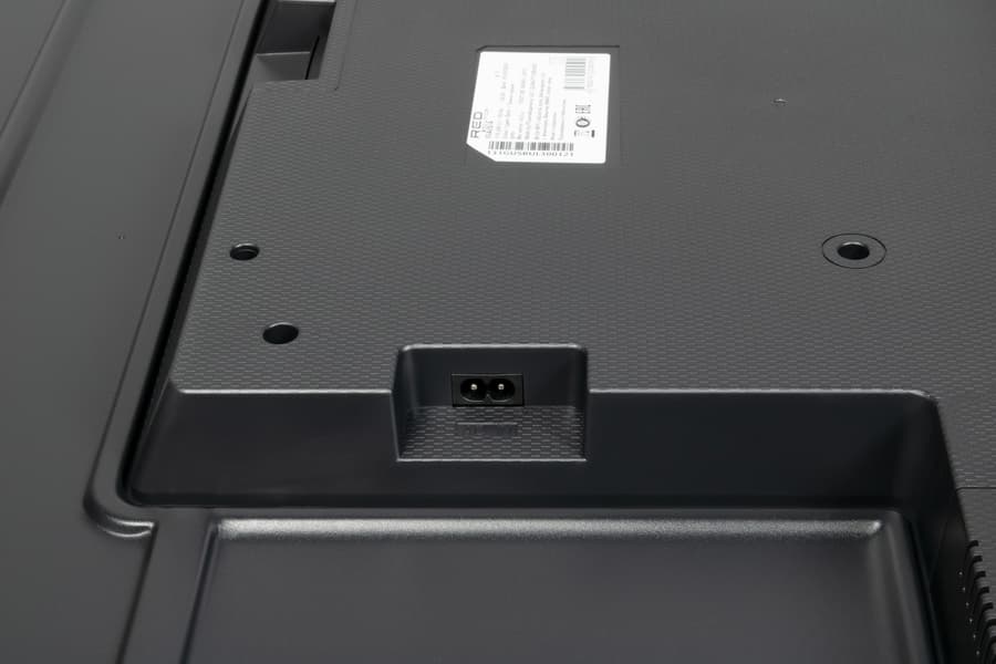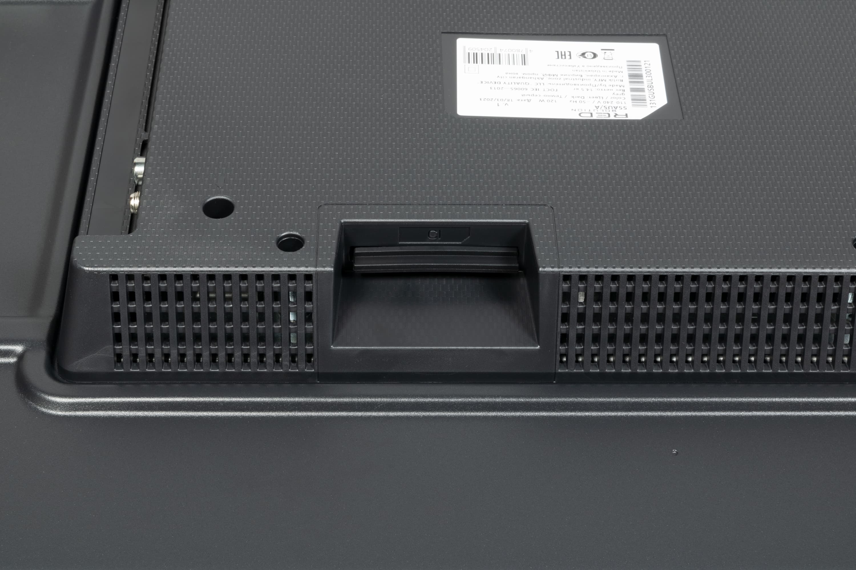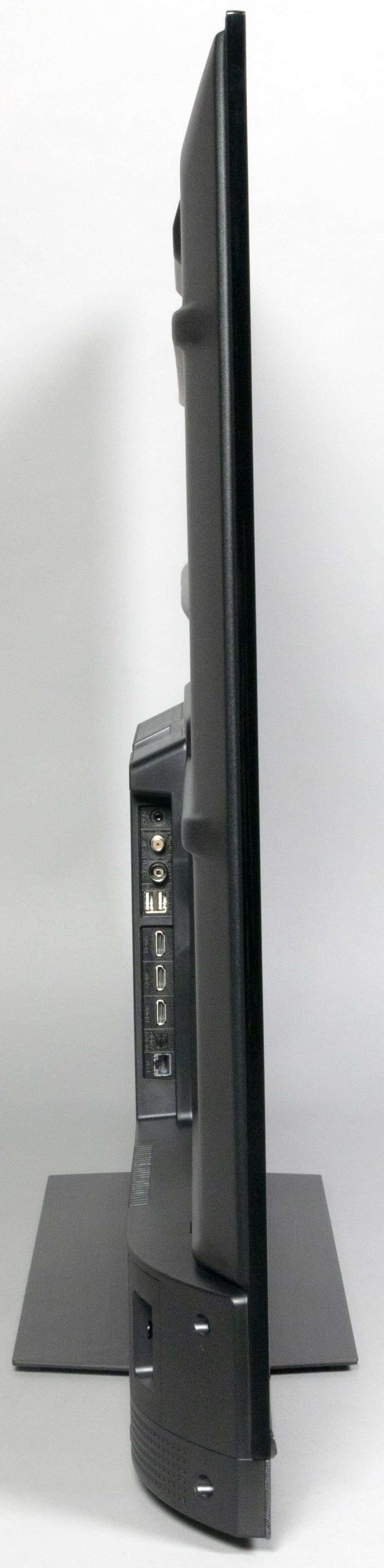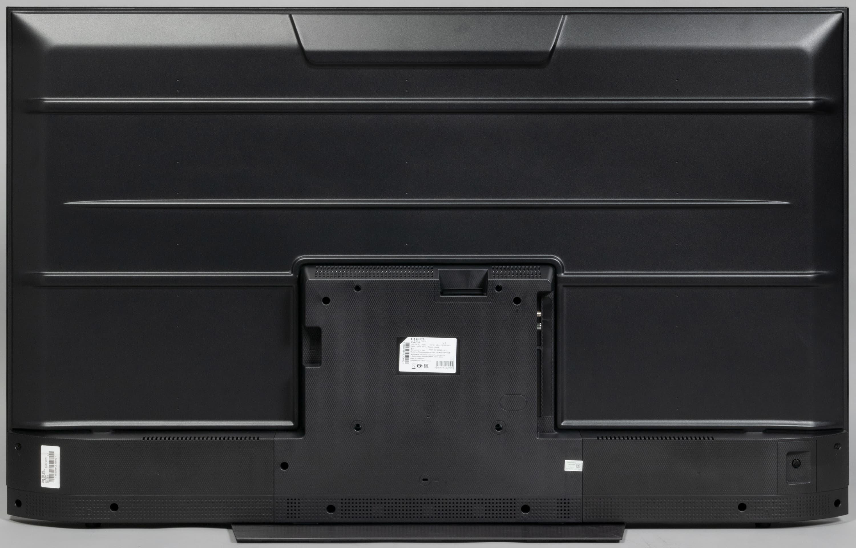 Задняя панель в верхней части изготовлена из тонкого листа стали и имеет стойкое черное матовое покрытие. В верхней части телевизор относительно тонкий. Выступающий назад кожух в нижней части с заходом на нижний торец изготовлен из черного пластика с матовой поверхностью. На этом кожухе сверху, сзади и снизу есть вентиляционные решетки. Большинство интерфейсных разъемов размещены в незамкнутой нише на кожухе сзади и направлены вбок. Спереди дотягиваться до разъемов неудобно, так как они расположены далеко от края. Разъем для карты доступа CI/CI+ — в нише сверху на кожухе, а разъем питания — также в нише и направлен в бок.