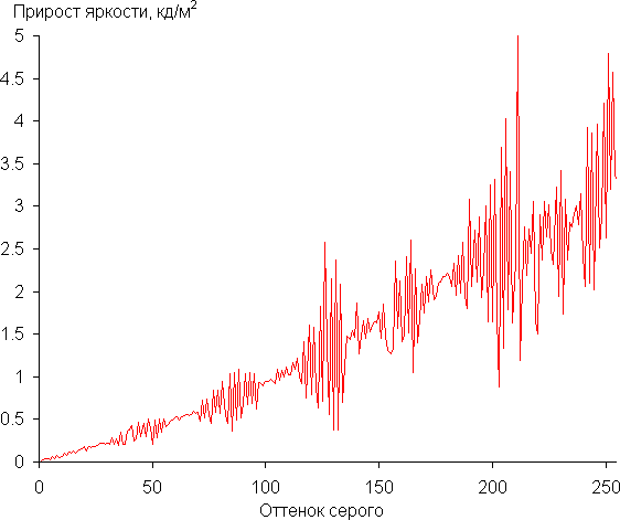 Далее мы измерили яркость 256 оттенков серого (от 0, 0, 0 до 255, 255, 255) при значении Средняя. График ниже показывает прирост (не абсолютное значение!) яркости между соседними полутонами: