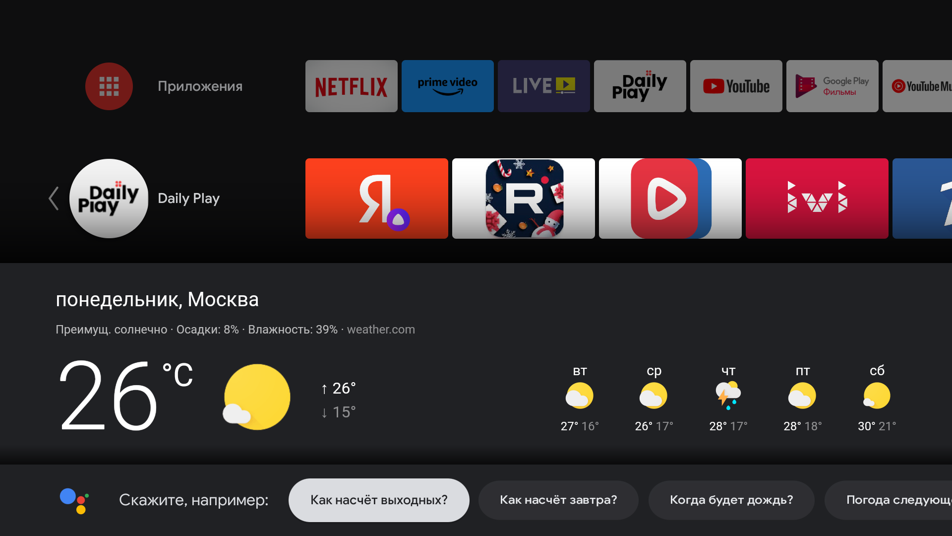 В передней части пульта рядом с индикатором есть отверстие микрофона. Голосовой помощник от Google запускается при нажатии на кнопку с цветастыми кружками (для ввода голосовой команды держать ее не нужно, а при включенном микрофоне на пульте горит зеленый индикатор), также его можно запустить с домашней страницы. Этот помощник поможет найти контент, который предоставляют ряд программ, и ответить на какие-то вопросы (показывает и проговаривает ответ), например, какая сейчас погода за окном.