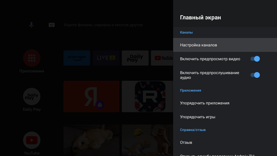 Домашняя страница (или Главный экран) в Android TV представляет собой несколько горизонтальных лент с плитками избранных установленных приложений и рекомендуемого контента. Кружки с подписями слева поясняют, к чему относятся содержимое лент, и позволяют запустить соответствующую программу (или выводят список установленных программ — кружок Приложения). В верхней части страницы есть значки-кнопки голосового и текстового ввода строки поиска, вывода системных сообщения, выбора входов, индикации подключения к сети, доступа к настройкам и часы.