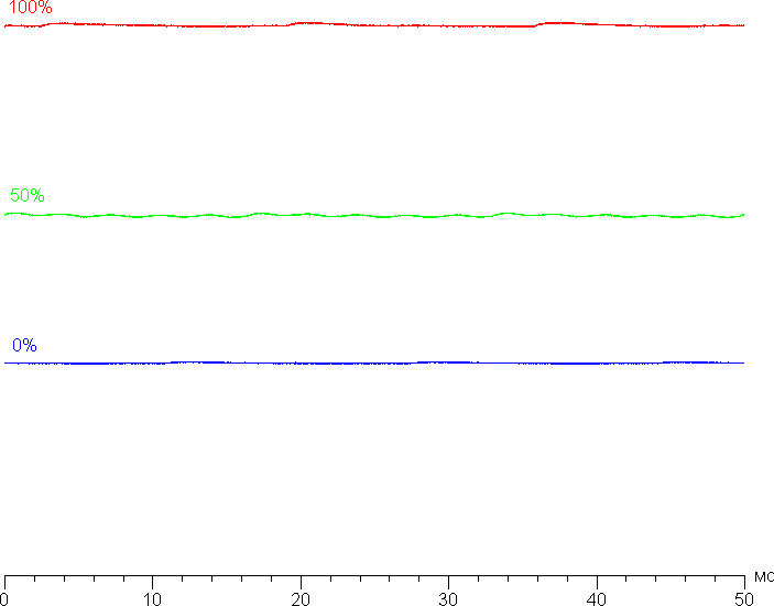 На любом уровне яркости значимая модуляция подсветки отсутствует, поэтому нет и никакого мерцания экрана. Для тех, кто привык распознавать знакомое сокращение, уточним: ШИМ отсутствует. В доказательство приведем графики зависимости яркости (вертикальная ось) от времени (горизонтальная ось) при различных значениях настройки Подсветка: