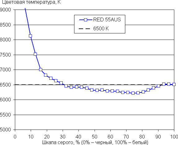 Без коррекции просто при выборе встроенных профилей для настройки Цветовой тон цветовой баланс средний, так как цветовая температура или существенно выше стандартных 6500 К или ниже. Поэтому мы попытались исправить цветовой баланс. Графики ниже показывают цветовую температуру на различных участках шкалы серого и отклонение от спектра абсолютно черного тела (параметр ΔE) после ручной коррекции (настройки усиления для красного, зеленого и синего цветов — 0/−10/−41):
