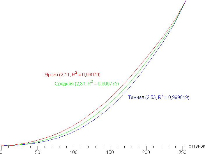 Для оценки характера роста яркости на шкале серого мы измерили яркость 17 оттенков серого при различных значениях параметра Гамма. На графике ниже приведены полученные гамма-кривые (значения показателей аппроксимирующей функции приведены в скобках в подписях, там же — коэффициент детерминации):