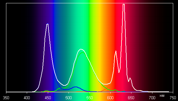 Ниже приведен спектр для белого поля (белая линия), наложенный на спектры красного, зеленого и синего полей (линии соответствующих цветов):
