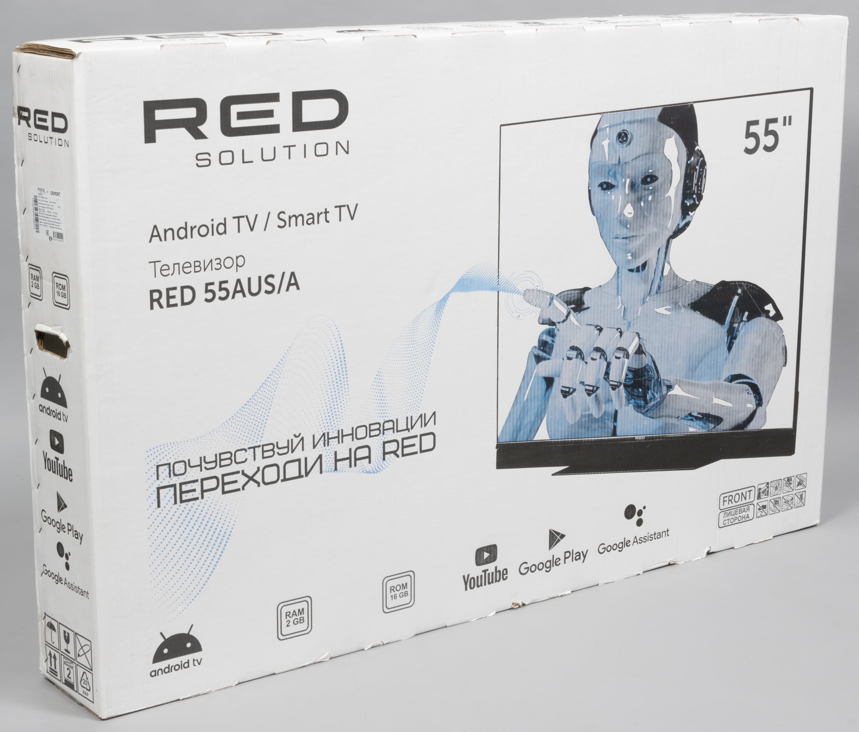 Телевизор Red 55AUS/A имеет строгий аккуратный дизайн с визуально безрамочным экраном. Работает он под управлением системы Android TV, поэтому пользователь может установить практически любое стороннее ПО, в наибольшей степени отвечающее его потребностям и личным предпочтениям. Телевизор можно рекомендовать для просмотра телевизионных передач, кино и сериалов, а также для не очень динамичных игр.