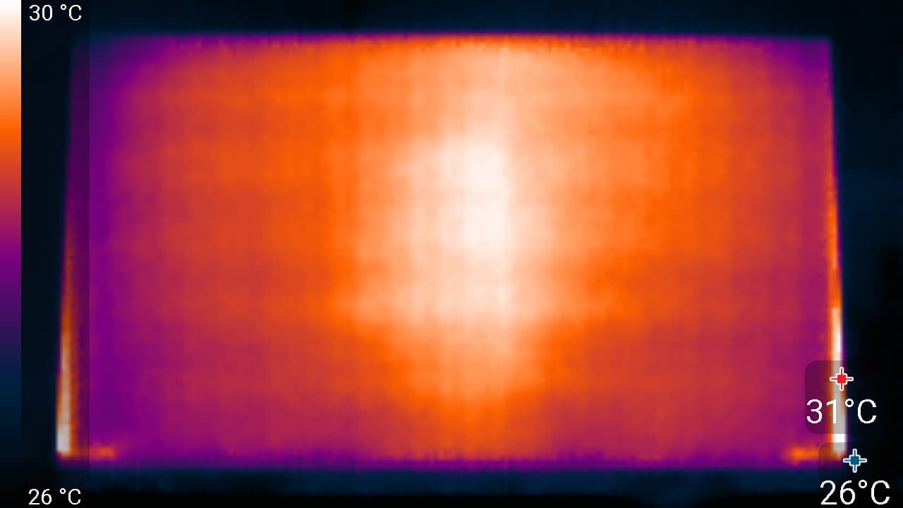Нагрев телевизора можно оценить по приведенному снимку с ИК-камеры, полученному после долговременной работы на максимальной яркости в помещении с температурой примерно 24 °C: