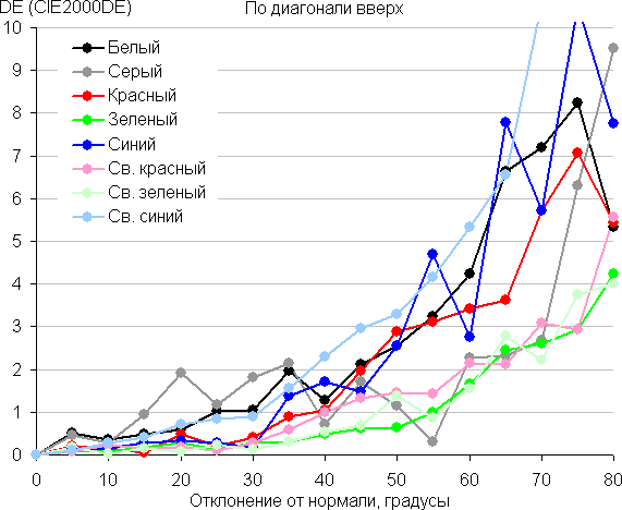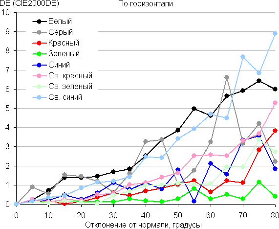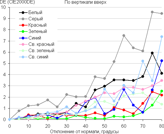 Для количественной характеристики изменения цветопередачи мы провели колориметрические измерения для белого, серого (127, 127, 127), красного, зеленого и синего, а также светло-красного, светло-зеленого и светло-синего полей во весь экран с использованием установки, подобной той, что применялась в предыдущем тесте. Измерения проводились в диапазоне углов от 0° (датчик направлен перпендикулярно к экрану) до 80° с шагом в 5°. Полученные значения интенсивностей были пересчитаны в отклонение ΔE относительно замера каждого поля при перпендикулярном положении датчика относительно экрана. Результаты представлены ниже:
