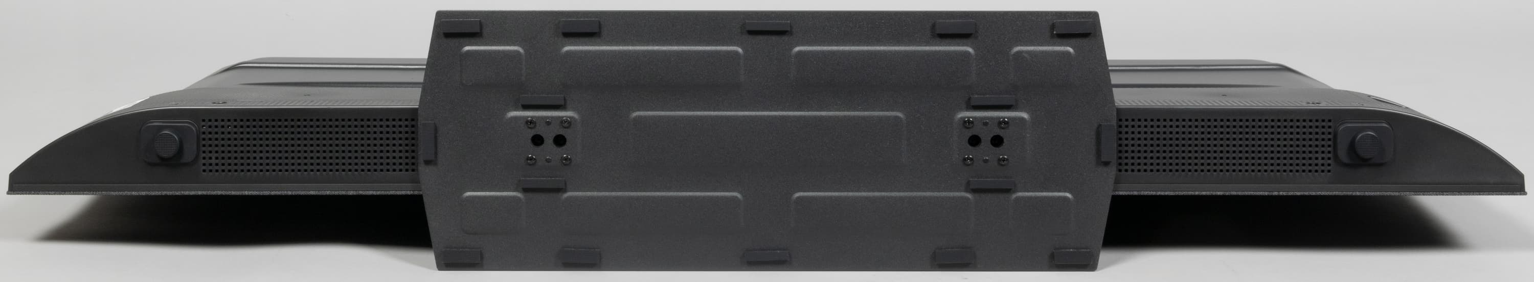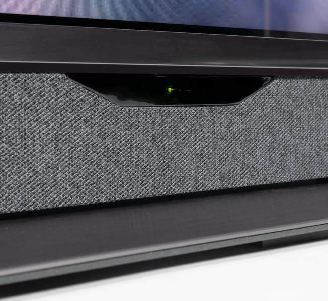 Часть корпуса ниже фронтальной планки обтянута тканью, которая скрывает решетки разнесенных громкоговорителей. По центру горизонтально под планкой есть вставка из прозрачного тонированного пластика, прикрывающая ИК-приемник пульта ДУ и индикатор состояния.