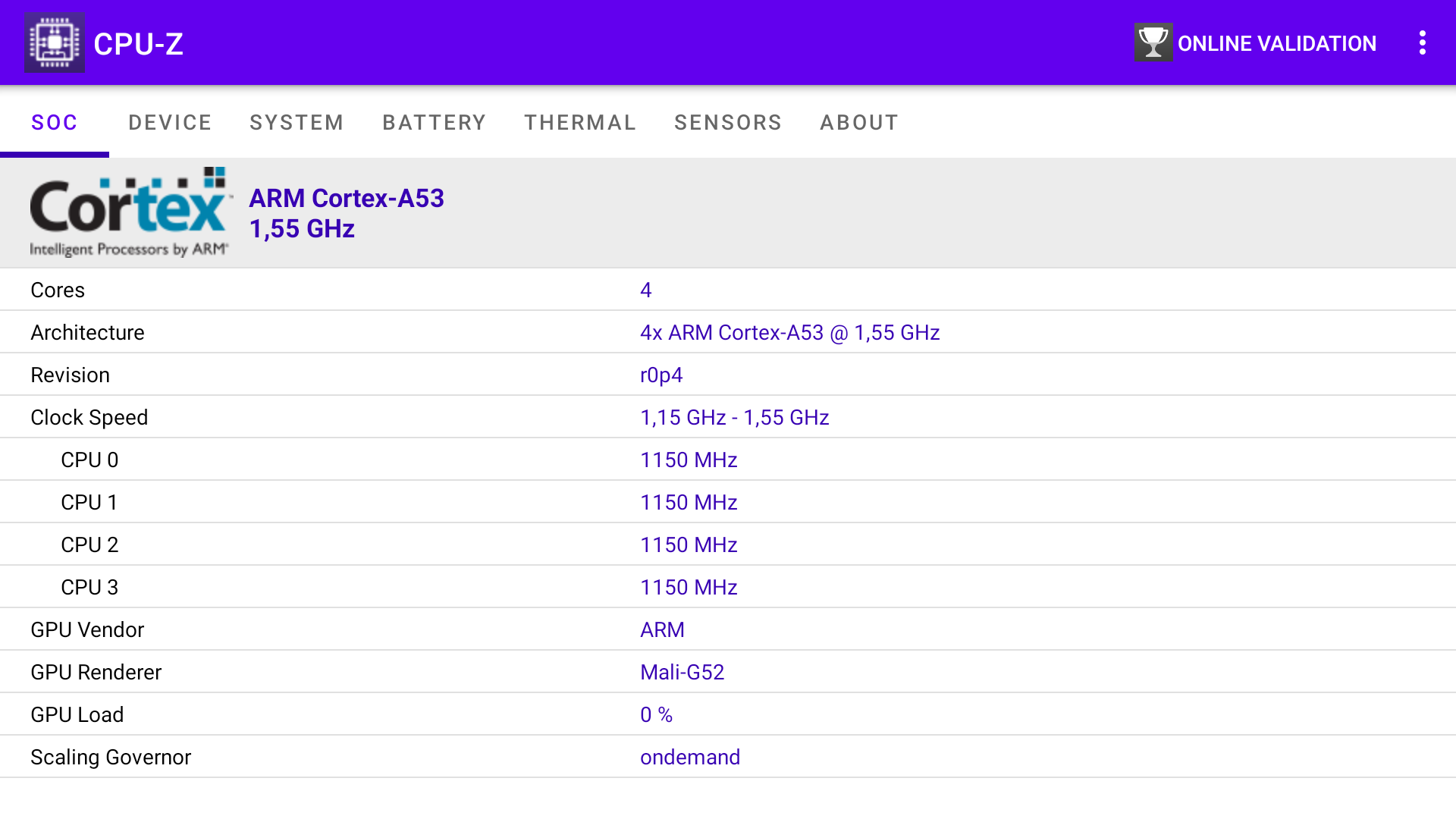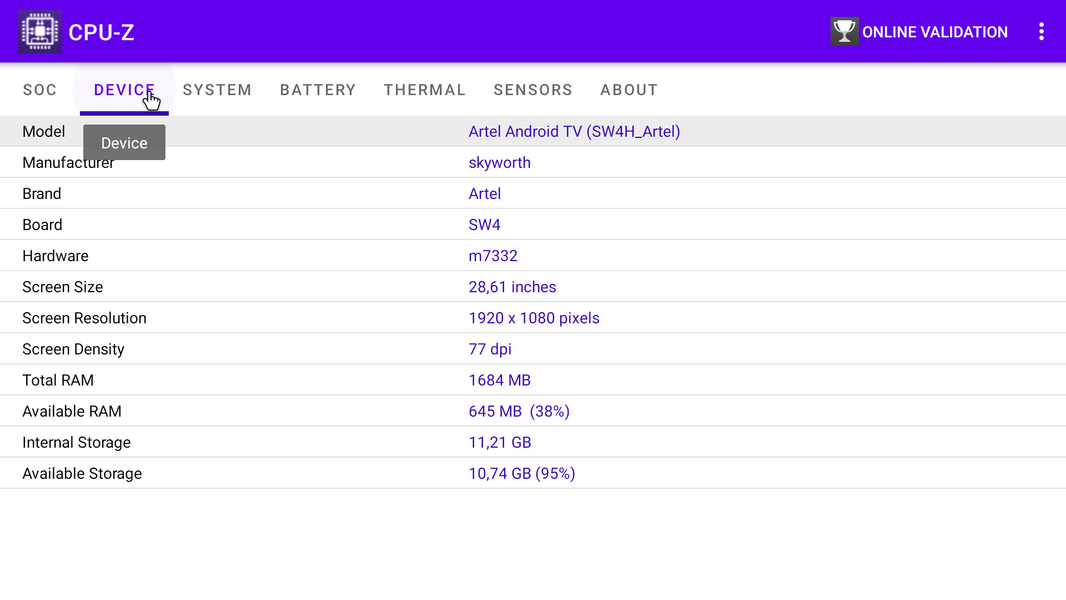 Программной платформой для этого ТВ служит операционная система Android TV, основанная на Android версии 10. Конфигурацию аппаратной части поясняют данные программы CPU-Z: