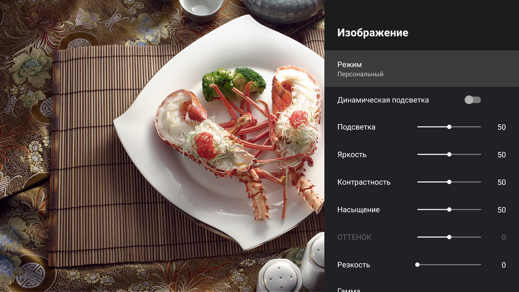 Настроек и в частности настроек изображения много. Основные настройки доступны, например, из меню настроек, вызываемого с домашней страницы. Настройки изображения и звука доступны только через контекстное меню, вызываемое кнопкой [Menu] на пульте.
