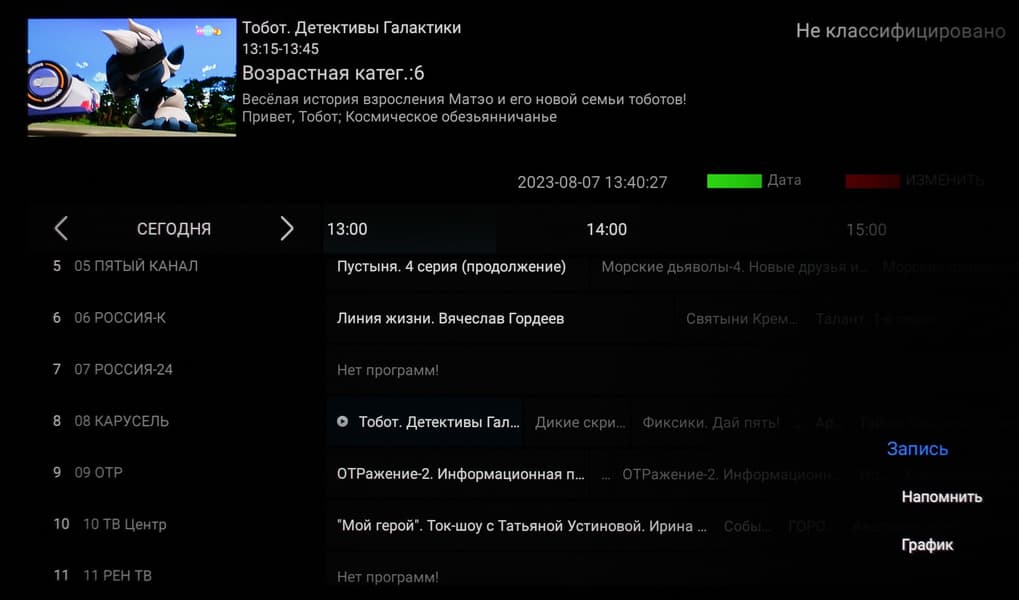 Присутствует список избранных программ. Есть хорошая поддержка электронной программы передач — можно посмотреть, что именно идет на текущем и других каналах, запрограммировать просмотр или запись программы или сериала и т. д.