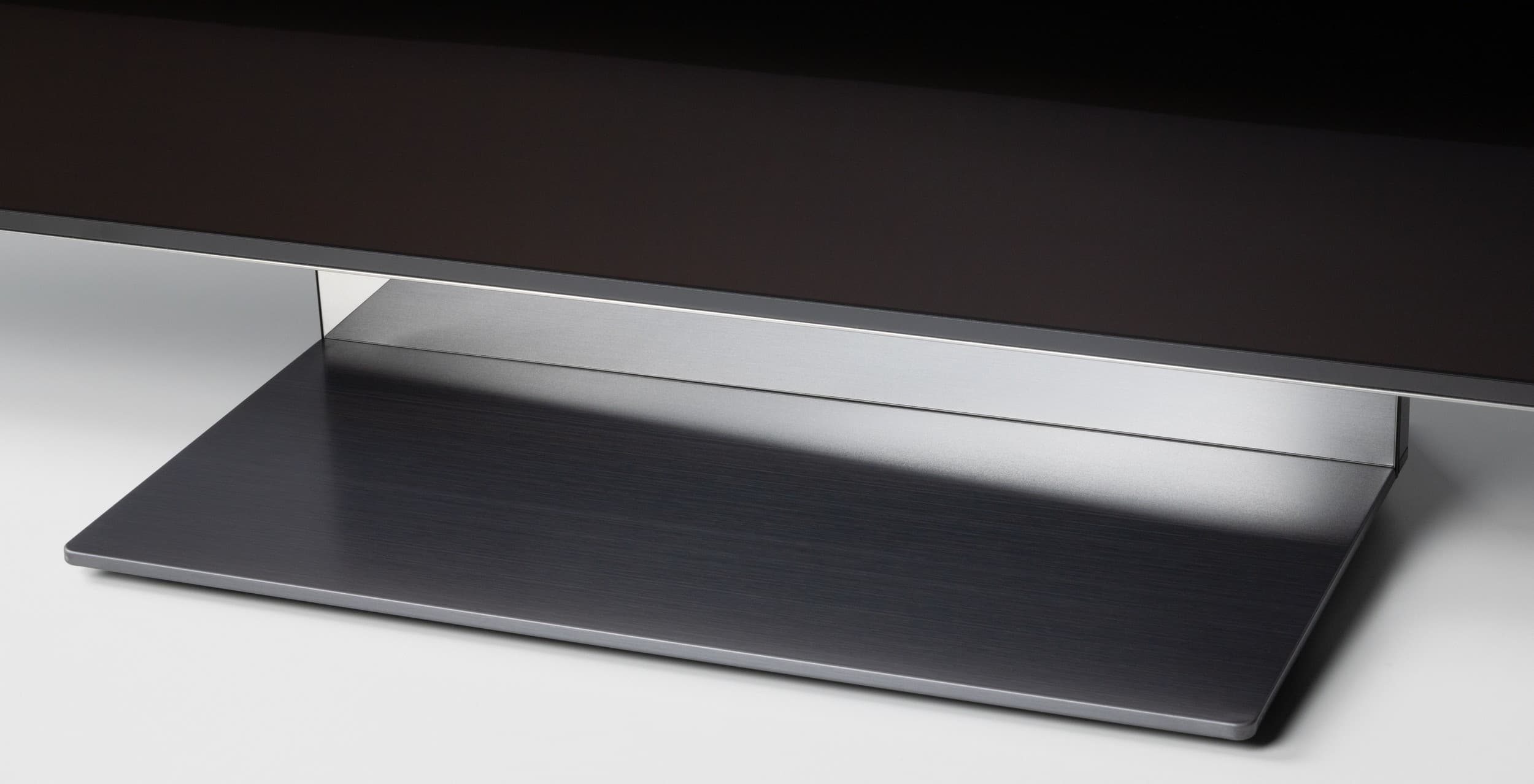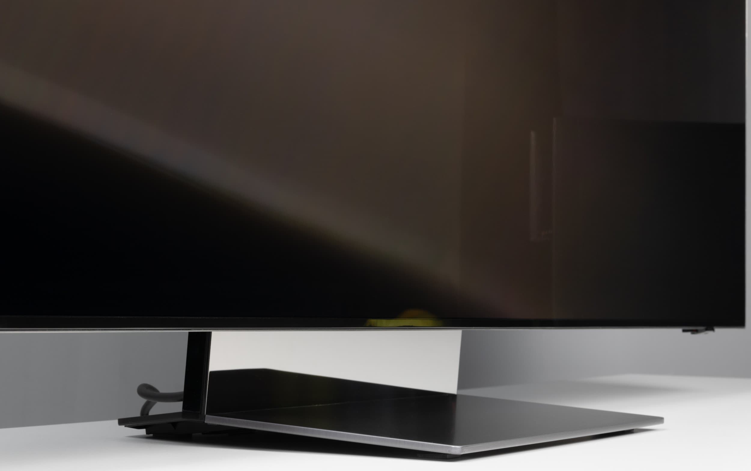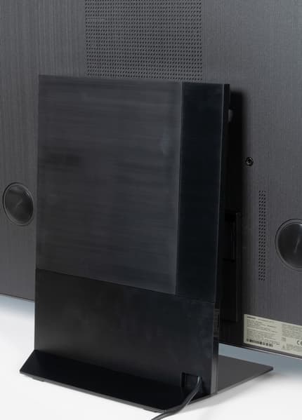 Несмотря на достаточно большую диагональ, телевизор оснащен центральной подставкой, что позволит устанавливать телевизор на не очень широкие тумбы. Подставка состоит из трех частей — основания, стойки и крепежной площадки, — которые соединяются между собой и с блоком экрана с использованием винтов, хитрых фиксаторов и магнитов. Несущие элементы подставки изготовлены из стали.