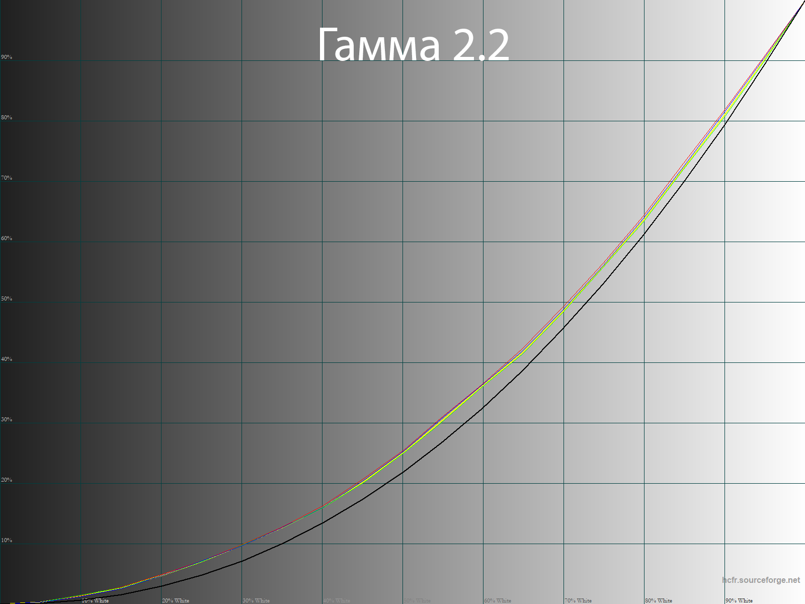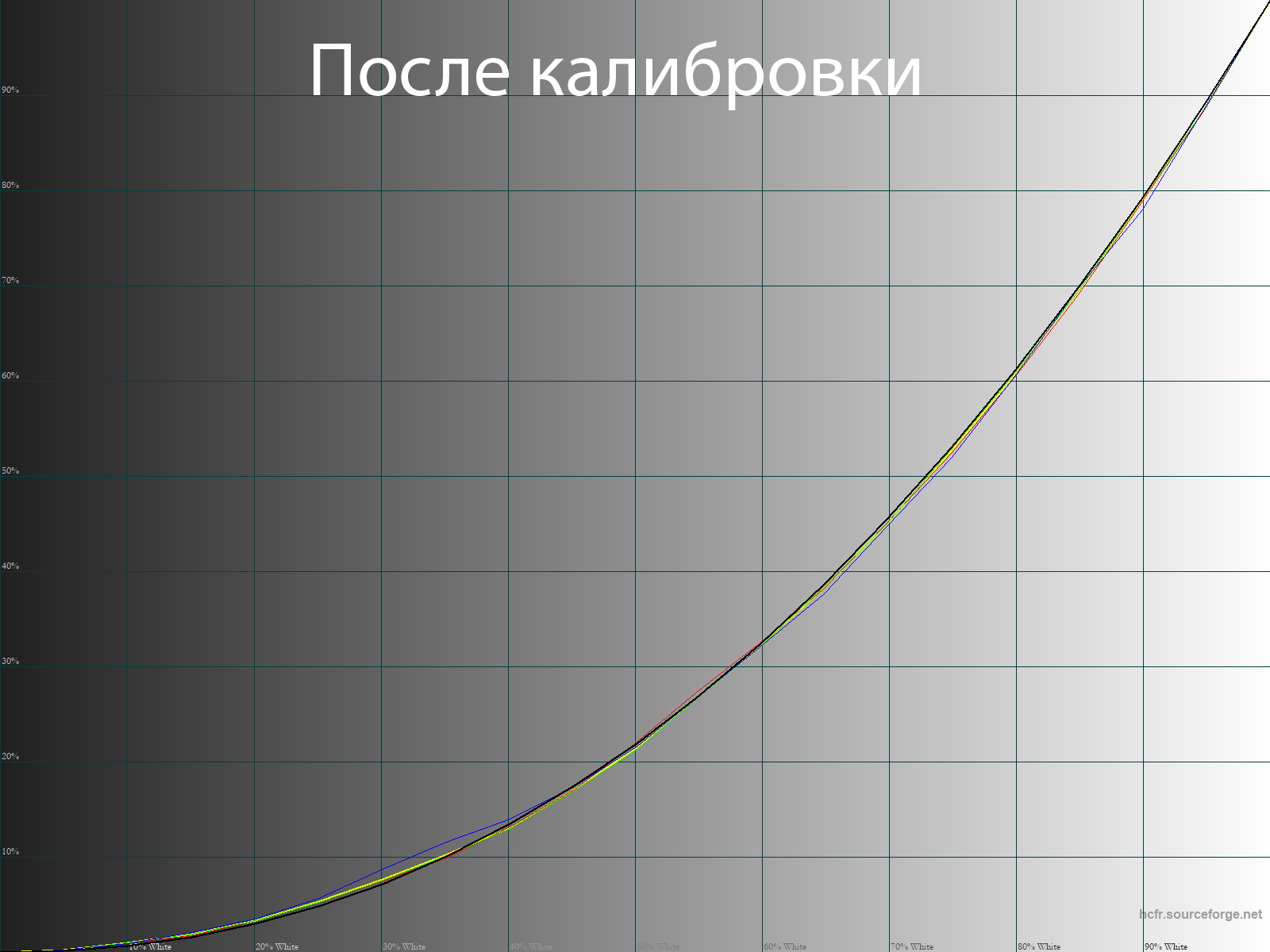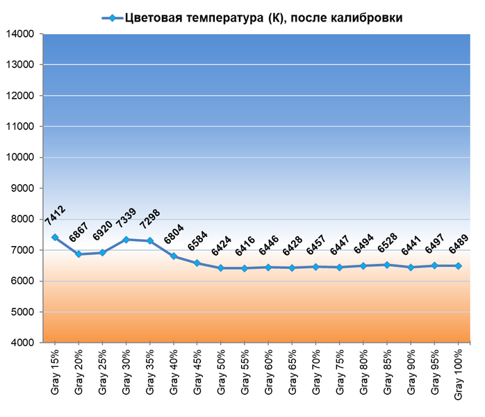 После настройки и калибровки точка белого пришла в абсолютную норму, увеличилась стабильность ЦТ оттенков серого. Среднее значение гаммы в этом случае составило 2,18.