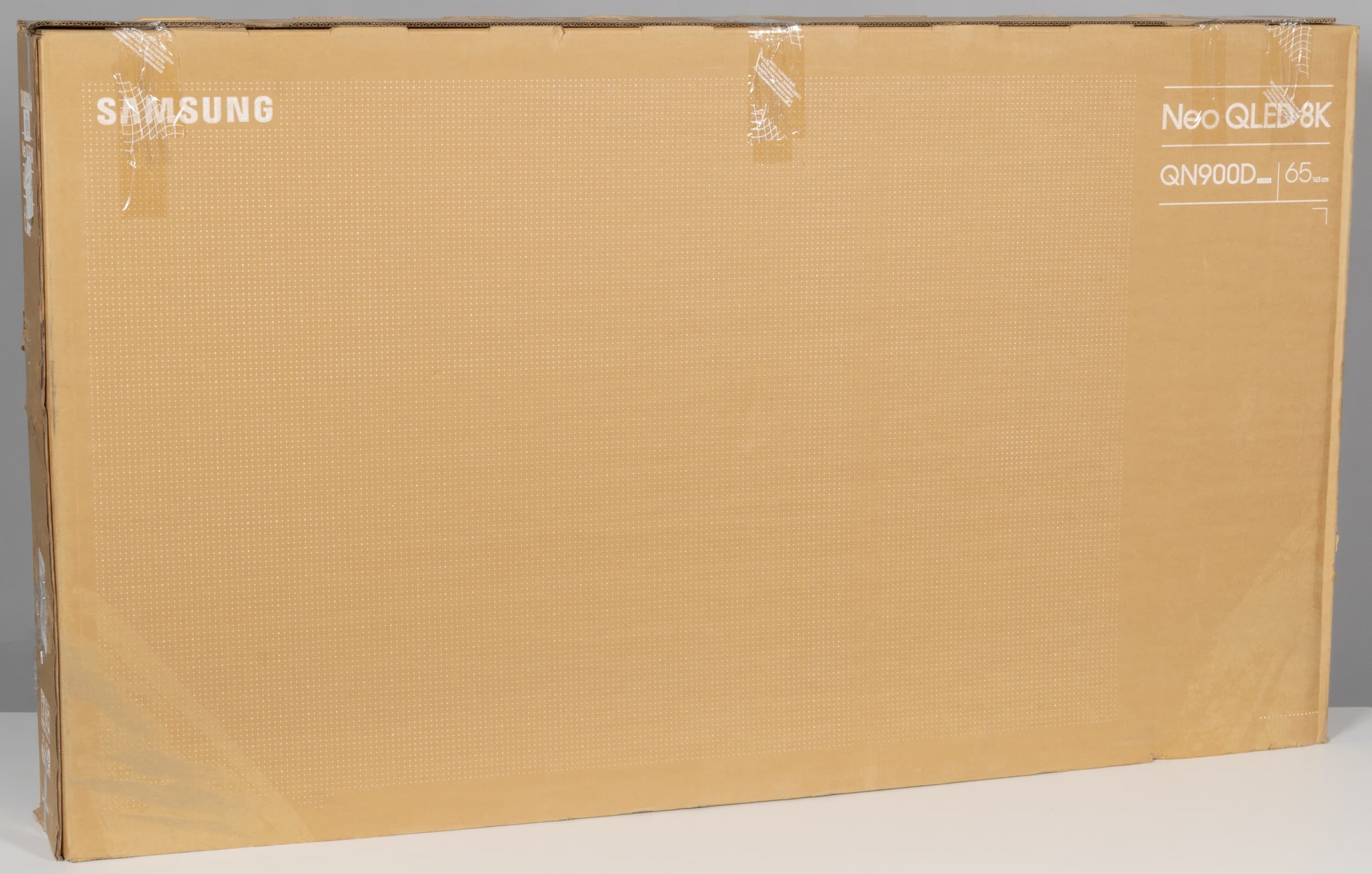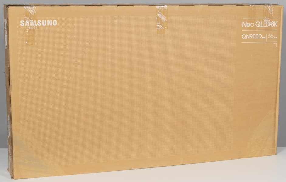 Упакован телевизор Samsung QLED 8K QN900D в коробку из гофрированного картона. С двух сторон упаковки отмечены только самые важные технические особенности модели. Для переноски в коробке проделаны боковые прорезные ручки.