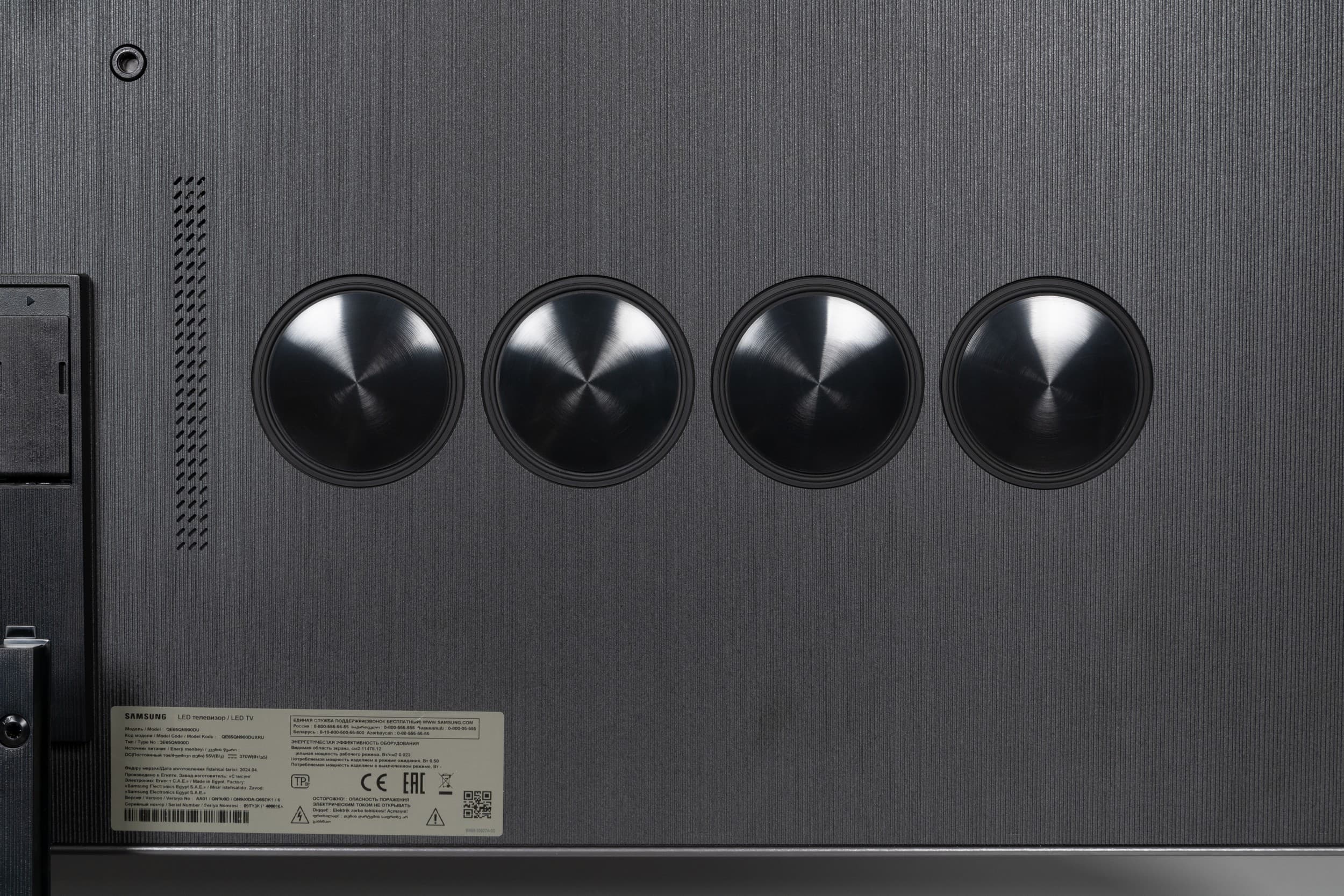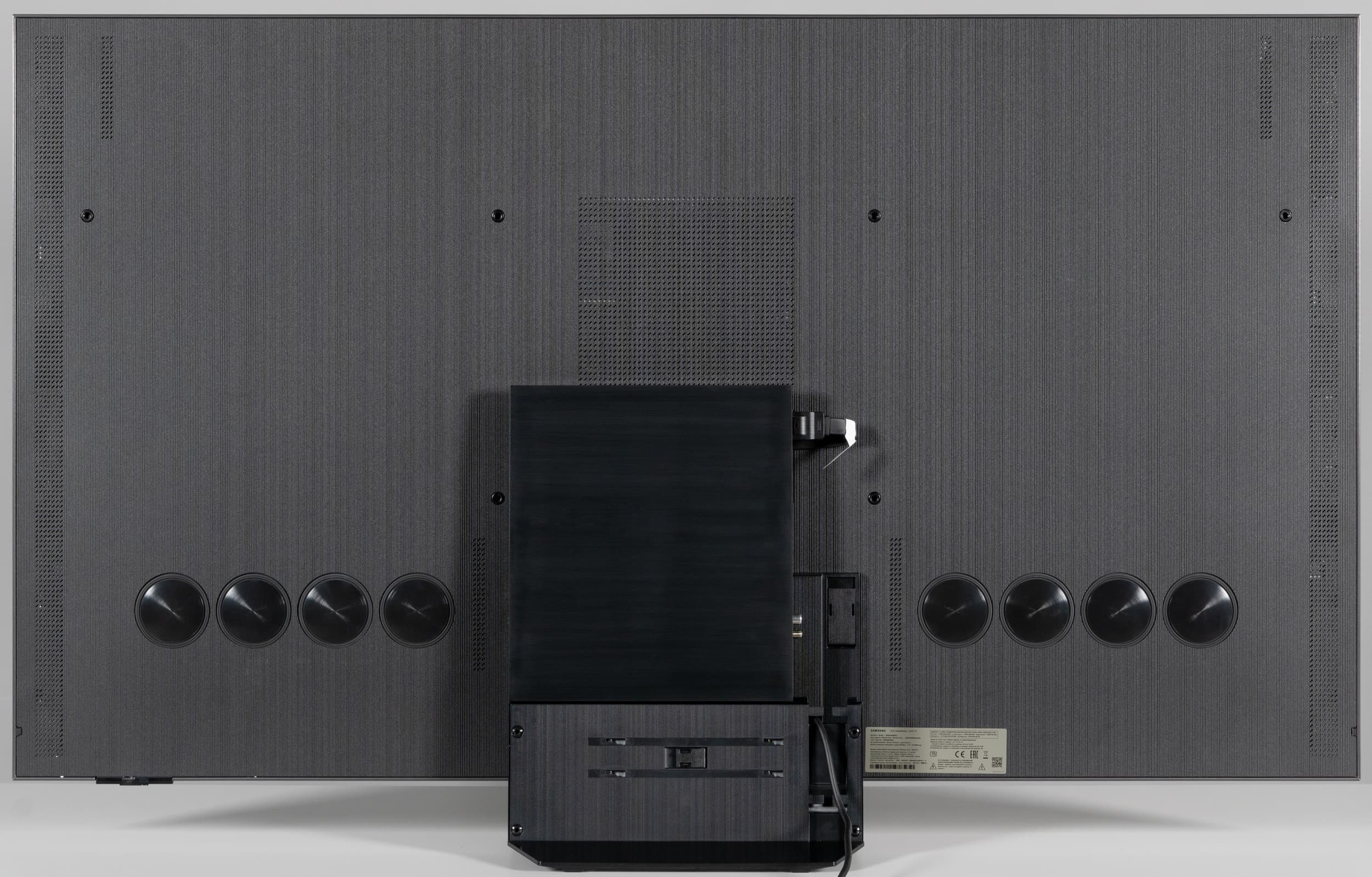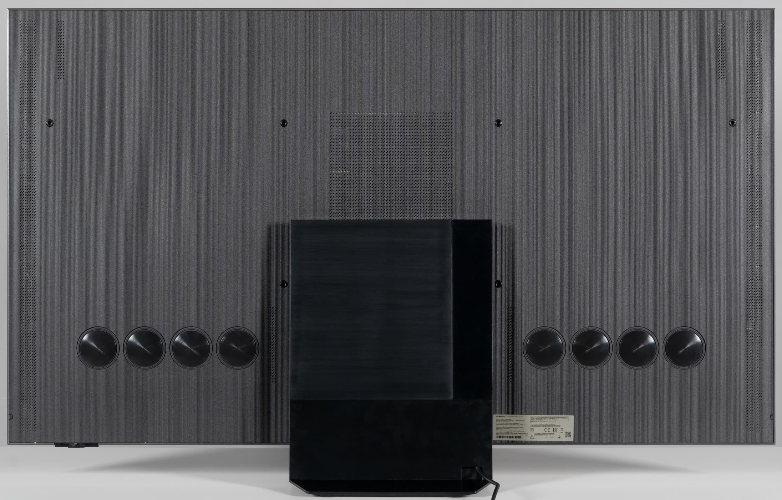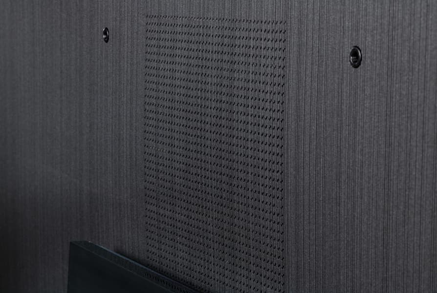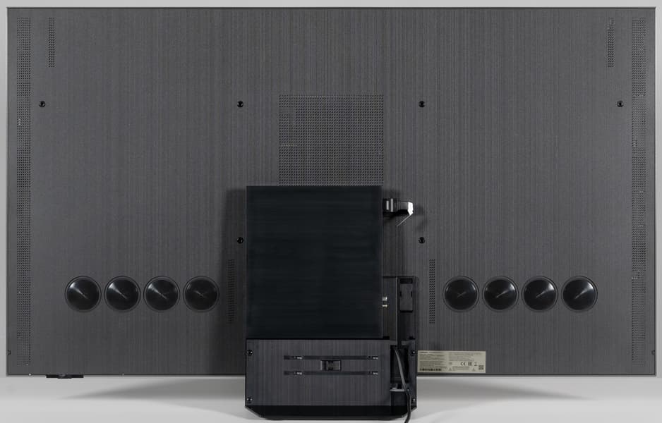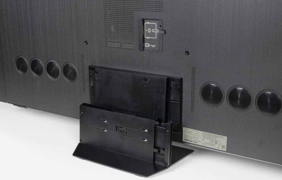 Встроенная акустическая система телевизора представлена по уникальной схеме 6.2.4. На задней панели ближе к нижней части горизонтально в ряд расположены две группы из четырех активных и пассивных излучателей (видимо, один активный и три пассивных в каждой группе). Также на задней панели вертикально в ряд ближе к краем есть решетки, за которыми находятся средне-высоко частотные громкоговорители. Судя по размеру диффузоров, по одному среднечастотному и одному высокочастотному справа и слева соответственно. В общей сложности в телевизоре используется 12 звуковых излучателей с общей выходной мощностью 90 Вт.