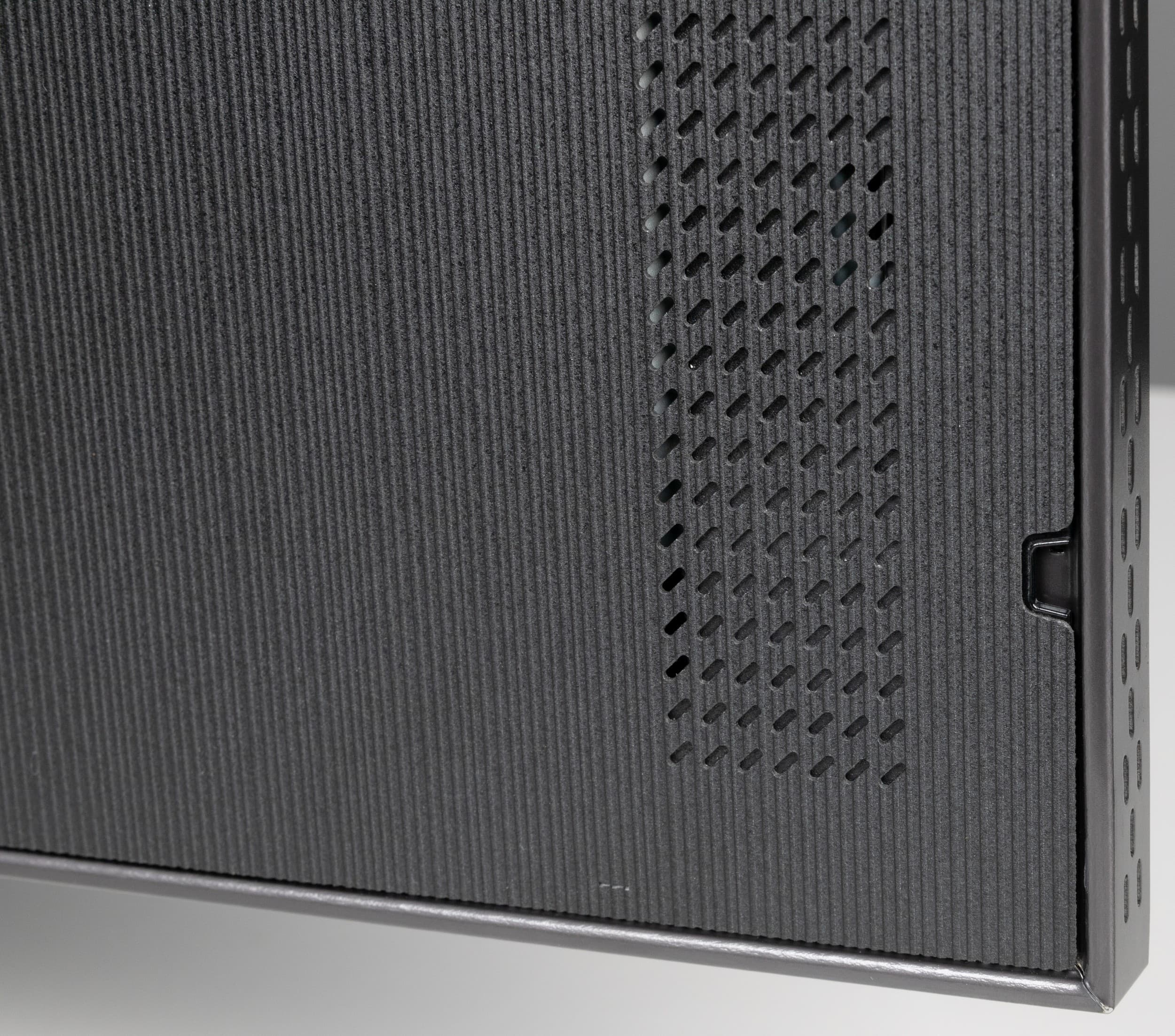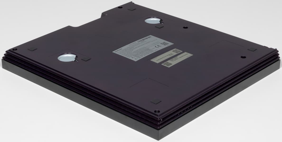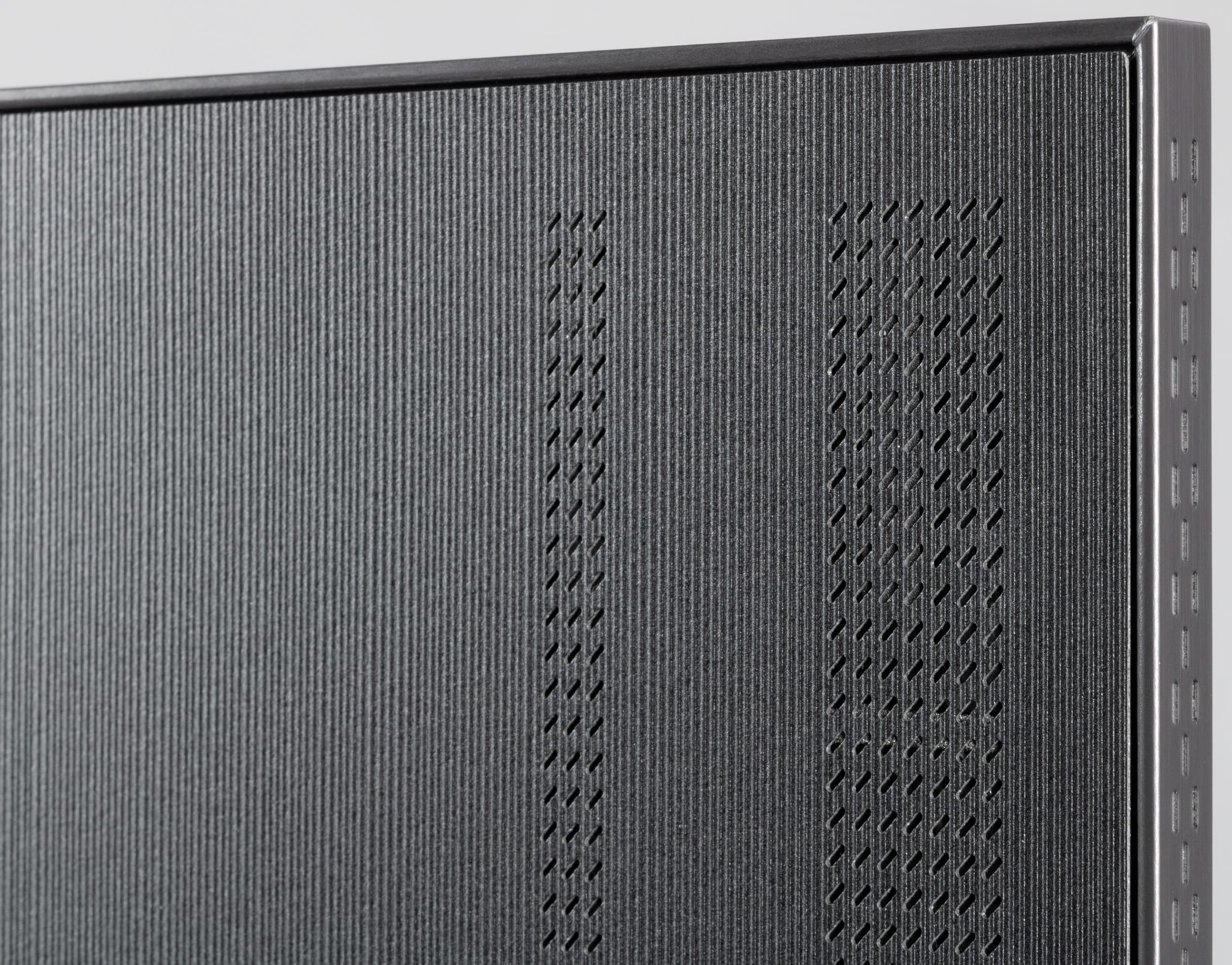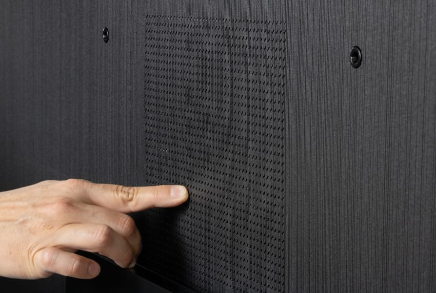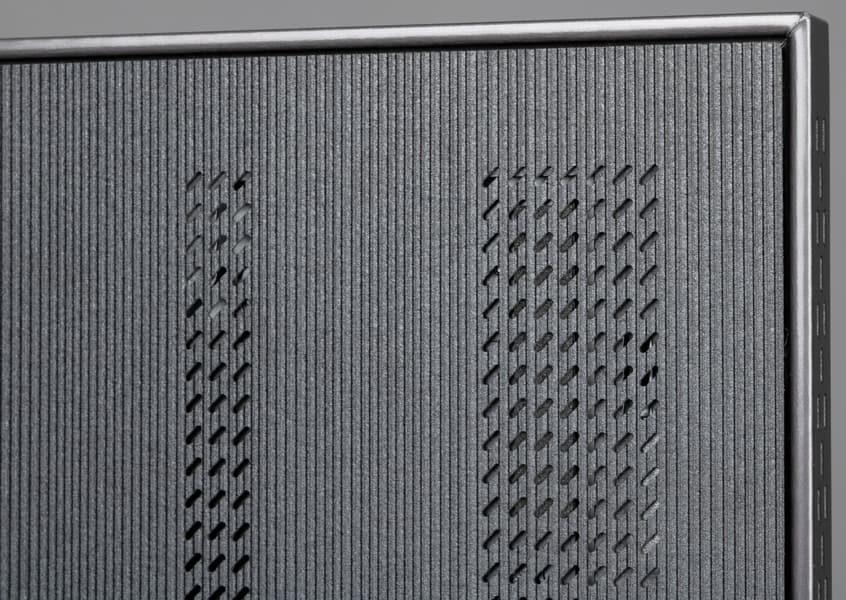 Встроенная акустическая система телевизора представлена по уникальной схеме 6.2.4. На задней панели ближе к нижней части горизонтально в ряд расположены две группы из четырех активных и пассивных излучателей (видимо, один активный и три пассивных в каждой группе). Также на задней панели вертикально в ряд ближе к краем есть решетки, за которыми находятся средне-высоко частотные громкоговорители. Судя по размеру диффузоров, по одному среднечастотному и одному высокочастотному справа и слева соответственно. В общей сложности в телевизоре используется 12 звуковых излучателей с общей выходной мощностью 90 Вт.