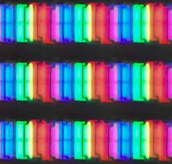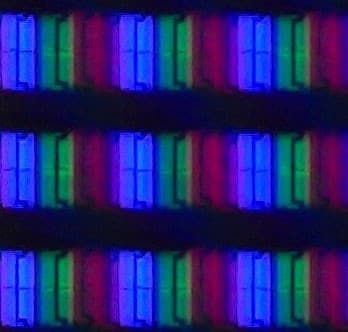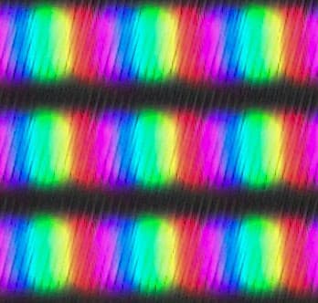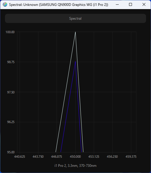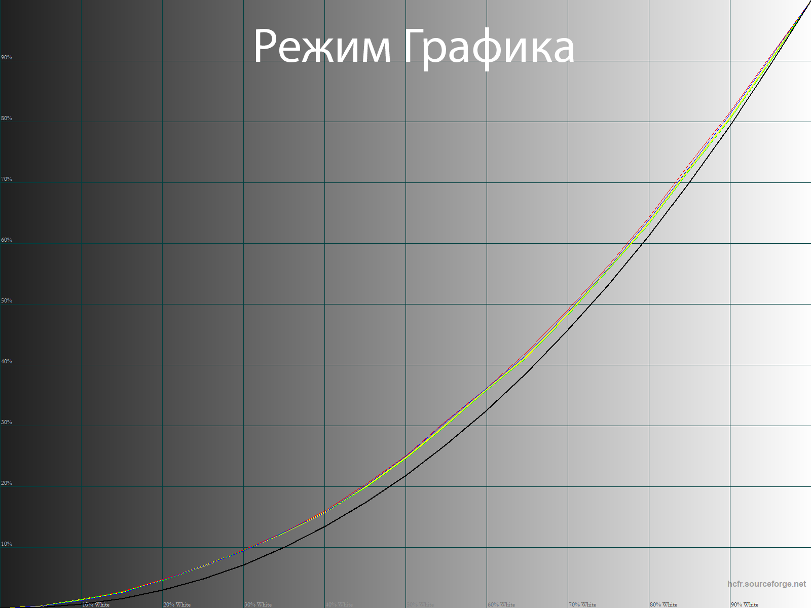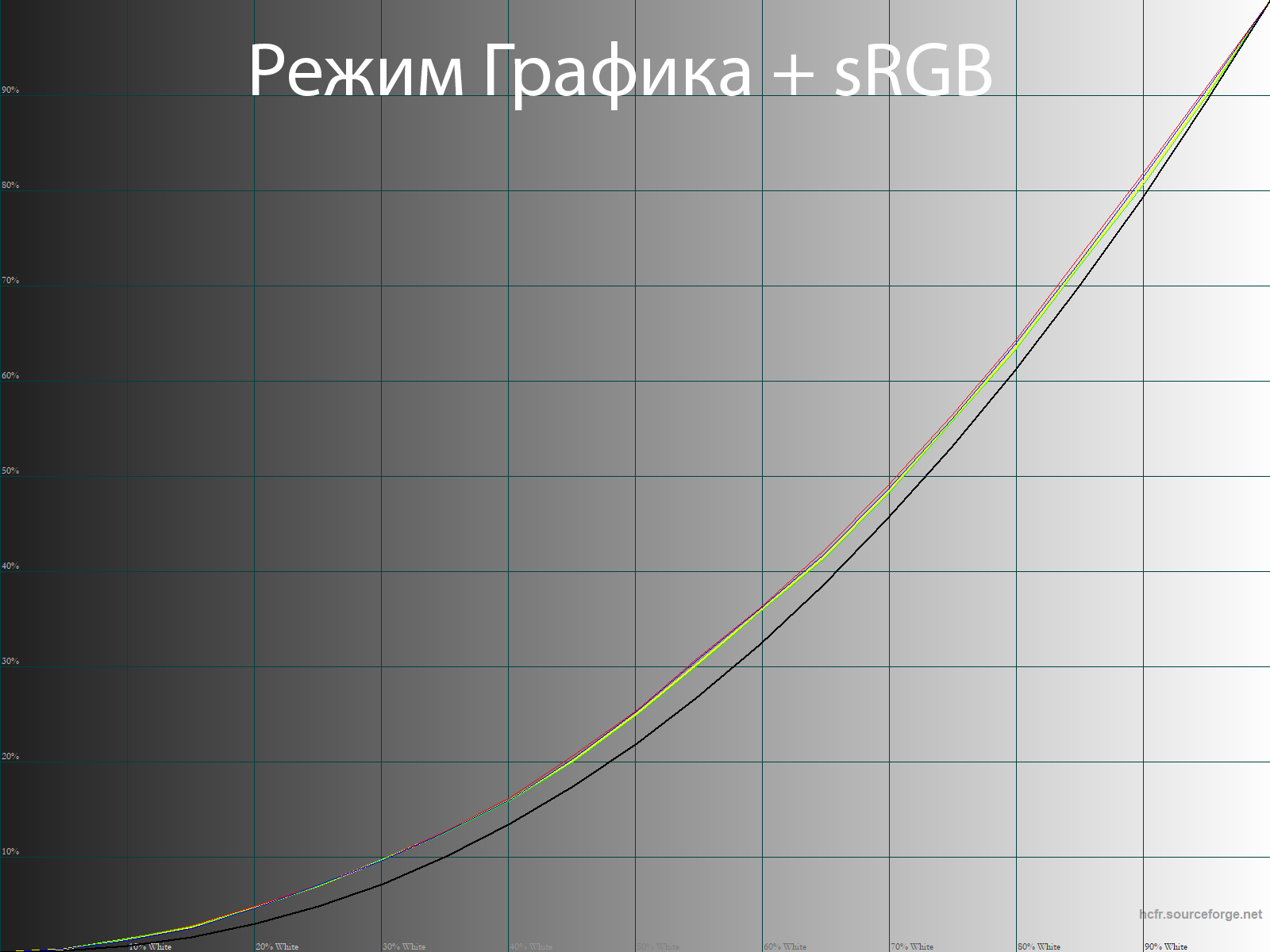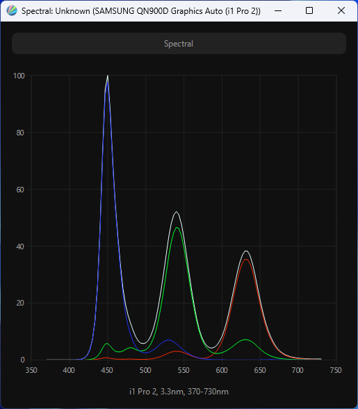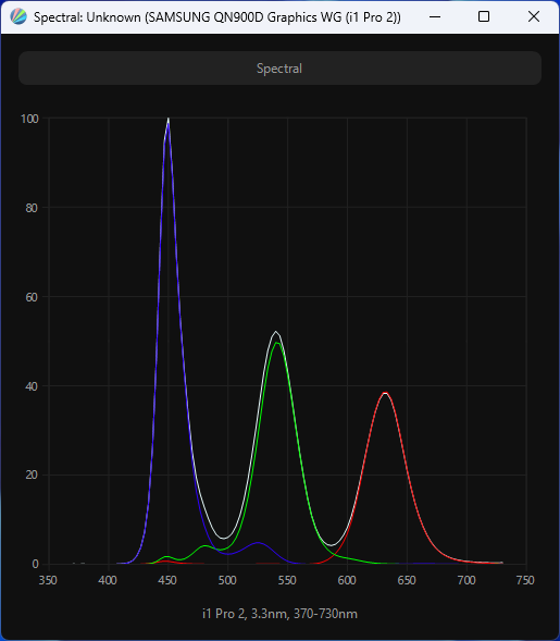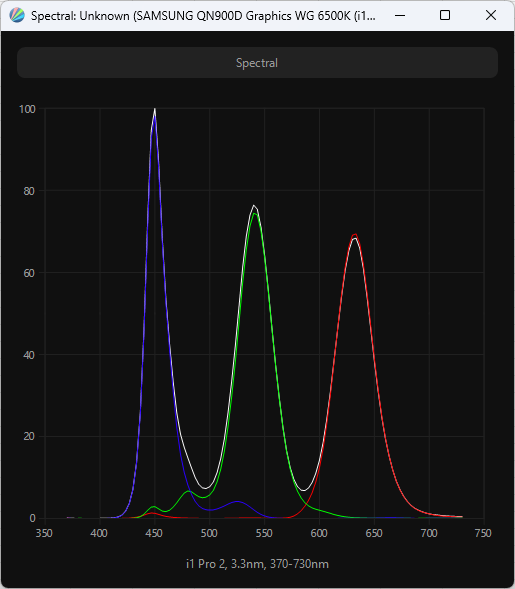 Выше приведен спектр для белого поля (белая линия), наложенный на спектры красного, зеленого и синего полей (линии соответствующих цветов) для режима «Графика» с полной цветовой гаммой. После настройки температуры точки белого на 6500 К интенсивность пиков на графике уравновешивается гораздо лучше, и в таком виде можно четко говорить о том, что в составе модификатора спектра светодиодной подсветки используются знаменитые «квантовые точки» (QD — Quantum Dots).