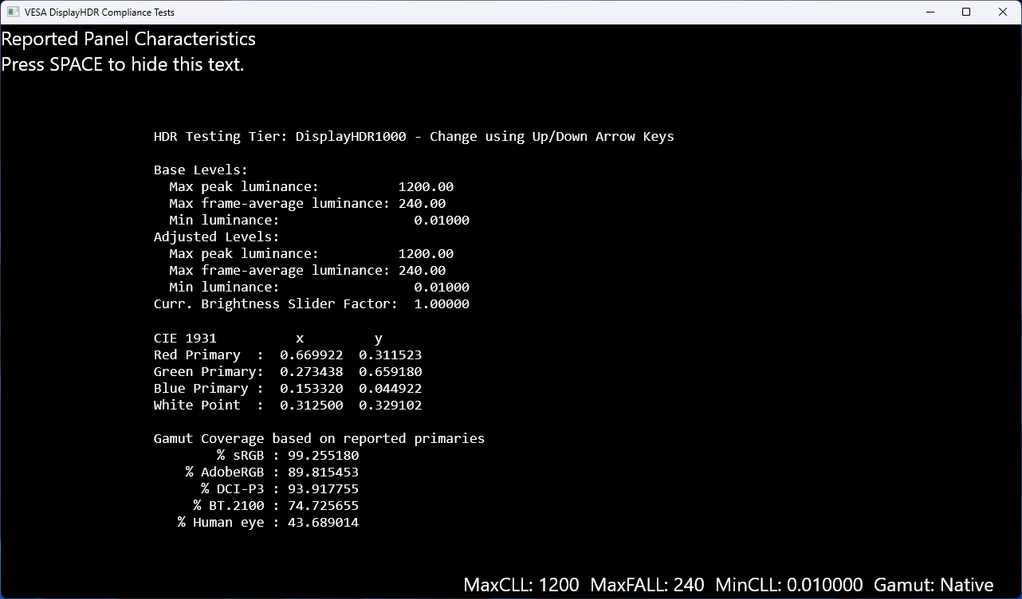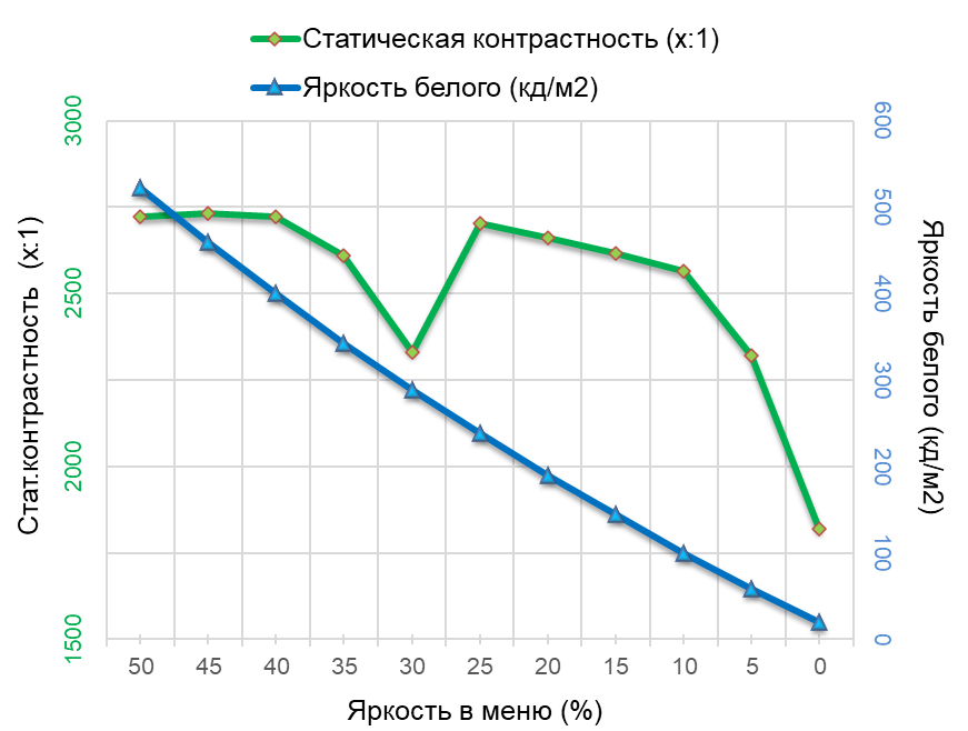 При заводских установках (с цветовой температурой точки белого в 11800 К) рабочий диапазон в центральной точке экрана составил 20—523 нит, а после приведения точки белого к значению 6500 К он изменился до 16—452 нит с плавным снижением яркости во всем диапазоне ее регулировки в меню устройства. При этом коэффициент контрастности плавает в достаточно широком диапазоне, что связано не только со сложностями недопущения работы функции «местное затемнение» в ходе тестирования, но и очень низкой яркости черного на уровне близком к 0,01 нит — теоретический предел для используемого колориметра.