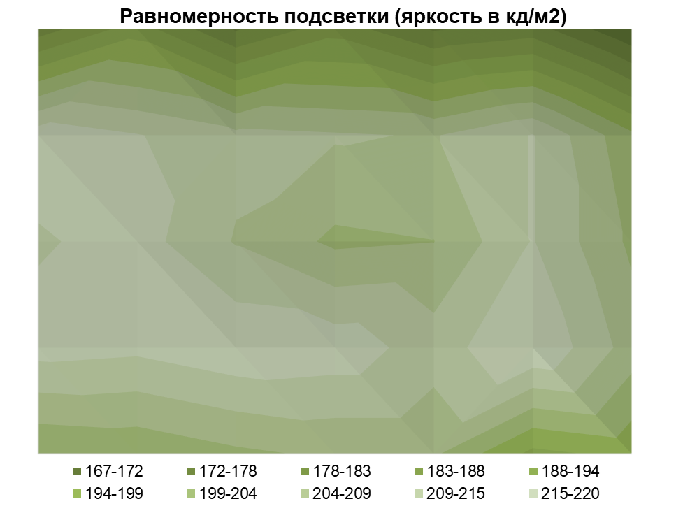 Эта особенность хорошо видна на темно-серых заливках. В остальном же зрительно равномерность подсветки по яркости сохраняется на отмеченных ранее уровнях.