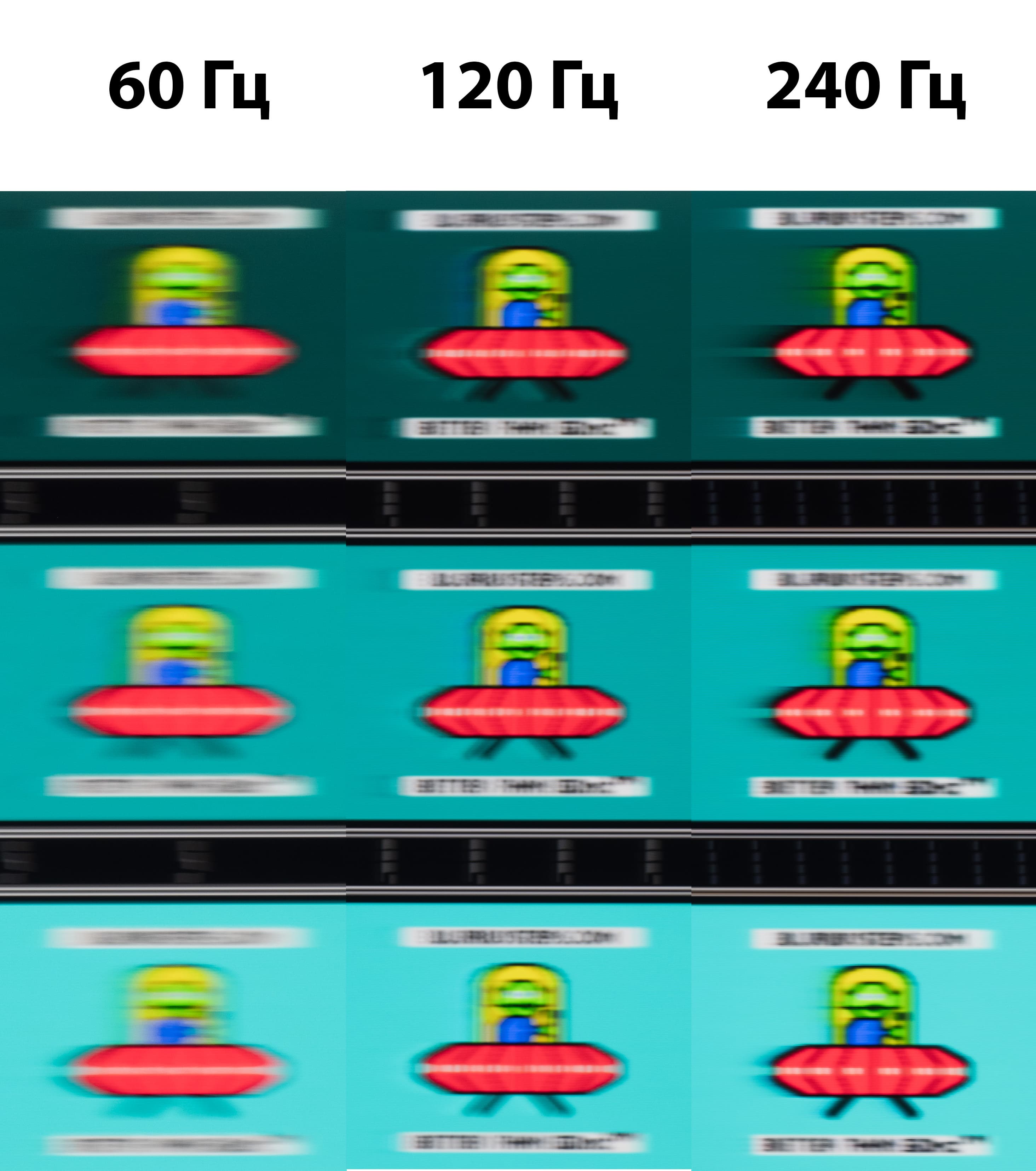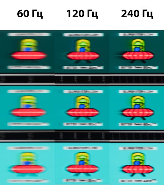 Для наглядного представления о том, что на практике означает такая скорость матрицы приведен снимок выше, полученный с помощью движущейся камеры. Подобные снимки показывают, что видит человек, если он следит глазами за двигающимся на экране объектом. В данном случае переход от классических 60 Гц к 120 Гц и 240 Гц приносит ощутимые изменения: движущиеся объекты становятся гораздо четче (лишь с точки зрения размытия, а не визуальной резкости, которая страдает при переходе к 4K и FHD) и плавнее.
