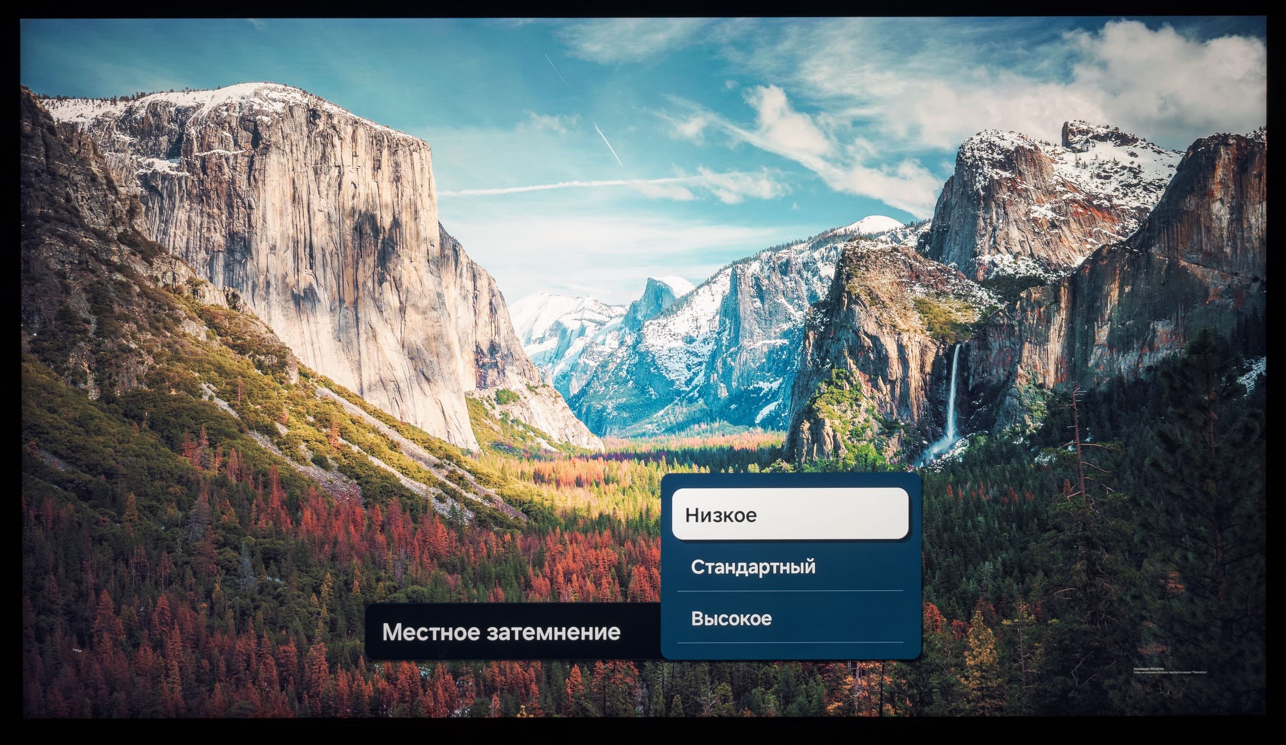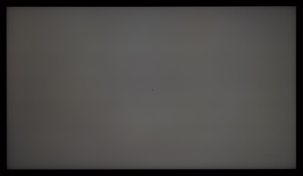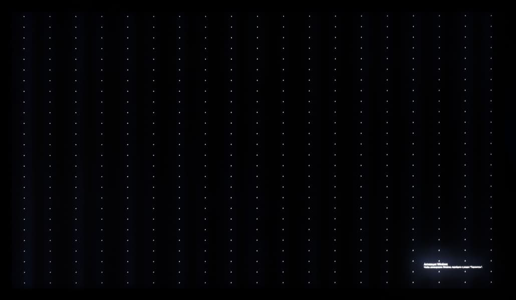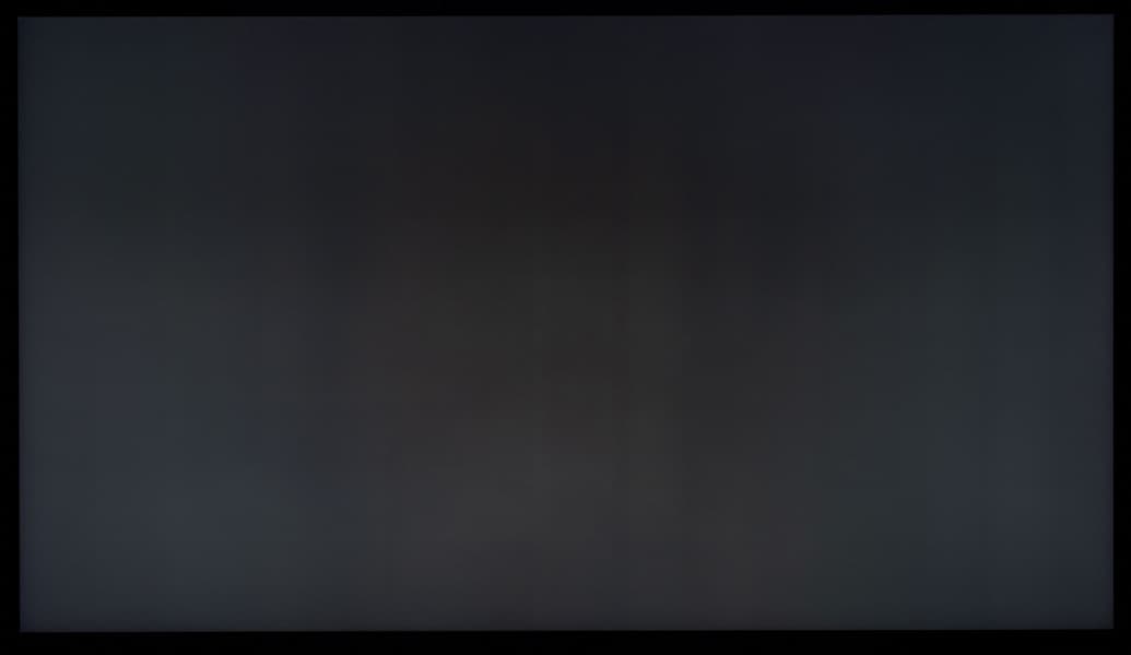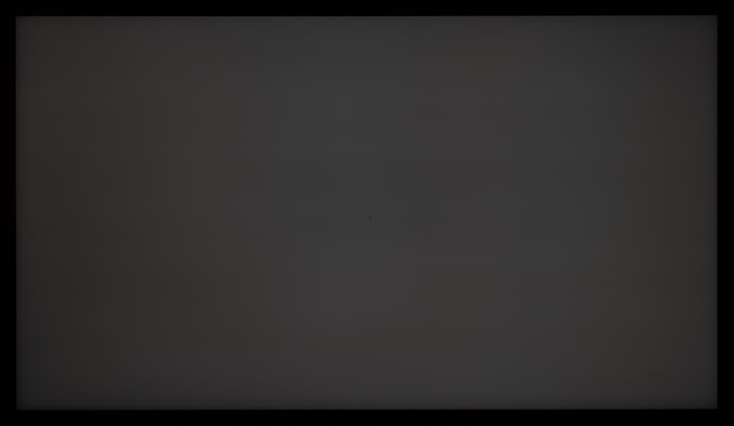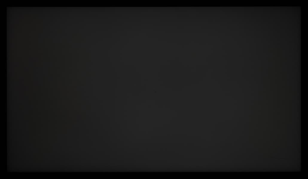 Теперь посмотрим на черное поле с расстояния порядка 2,5-3 метров. Телевизор Samsung не позволяет полностью дезактивировать функцию «местное затемнение». По умолчанию она выставлена в положение «Низкое» и при выводе черного экрана без каких-либо графических элементов подсветка фактически гаснет, но если на экране что-то есть (как в нашем случае), то выпадает прекрасная возможность оценить реальную равномерность подсветки на черном. Также мы проверили поведение подсветки Mini-LED в случае установки «местного затемнения» в положение «высокое».