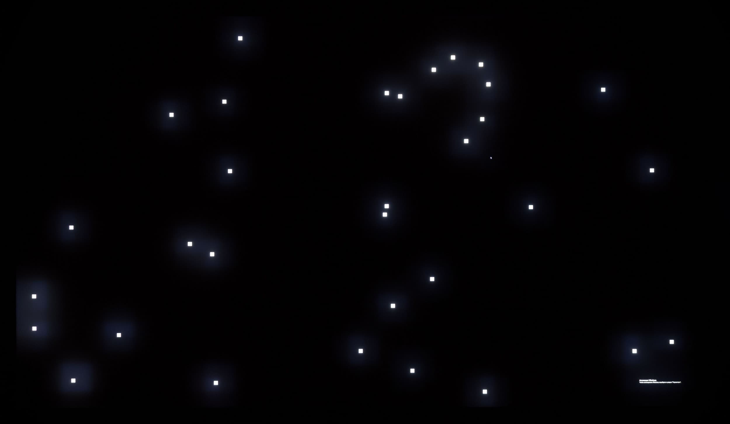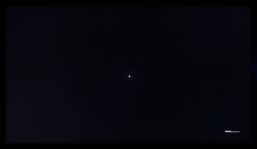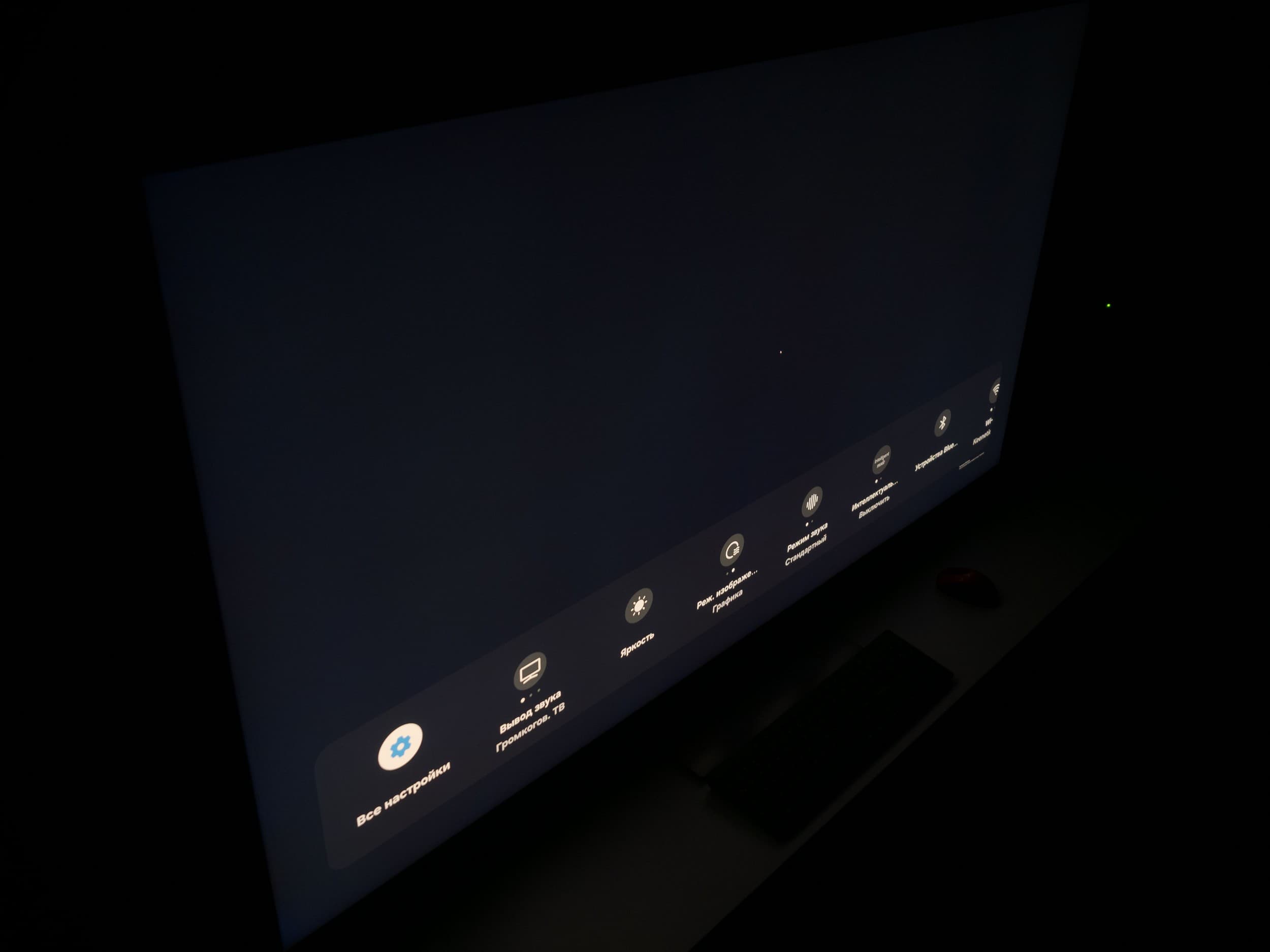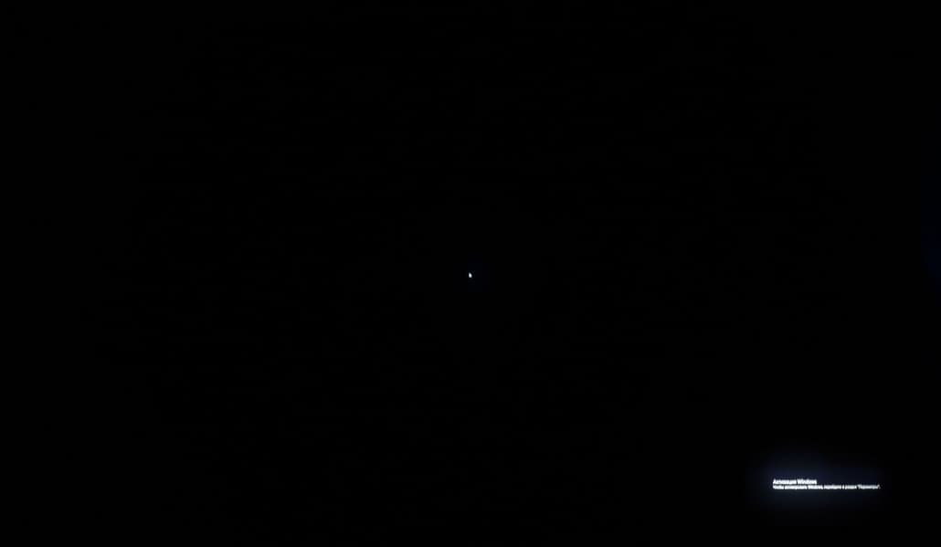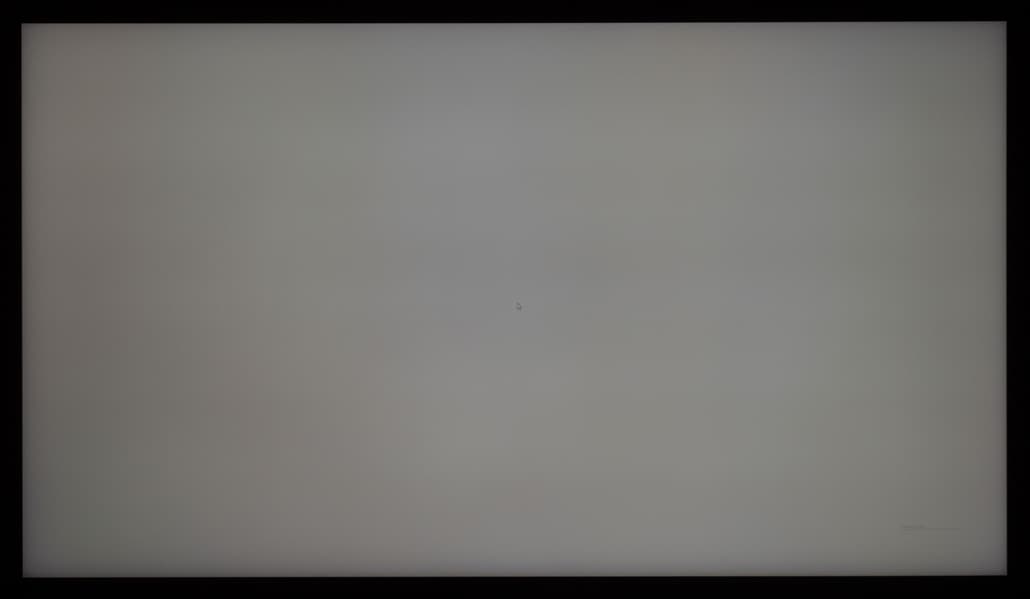Теперь посмотрим на черное поле с расстояния порядка 2,5-3 метров. Телевизор Samsung не позволяет полностью дезактивировать функцию «местное затемнение». По умолчанию она выставлена в положение «Низкое» и при выводе черного экрана без каких-либо графических элементов подсветка фактически гаснет, но если на экране что-то есть (как в нашем случае), то выпадает прекрасная возможность оценить реальную равномерность подсветки на черном. Также мы проверили поведение подсветки Mini-LED в случае установки «местного затемнения» в положение «высокое».