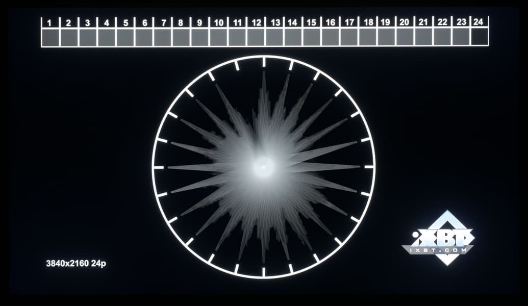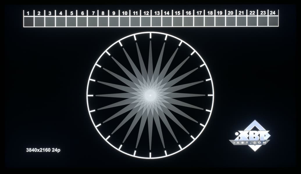 В более сложных тестах многозонная система подсветки телевизора Samsung показывает себя хорошо, но не идеально. Есть характерные утечки света на области, которые должны (в идеализированном варианте) оставаться черными, но это в порядке вещей даже для самого продвинутого жидкокристаллического экрана с подсветкой Mini-LED.