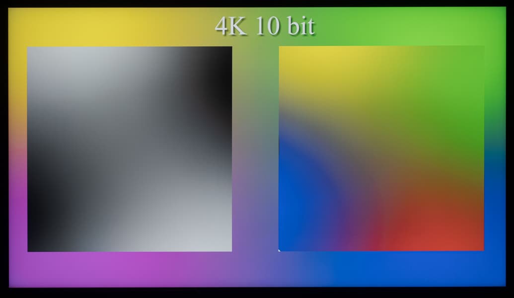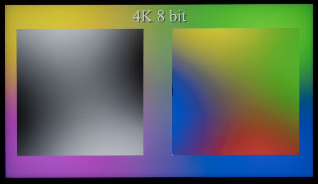 Качественную оценку мы начнем с демонстрации градиентов при выводе изображения в 8-битном и 10-битном режимах. Наглядно видно, что телевизор способен выводить градиенты в 10-битном режиме более качественно, чем в стандартном 8-битном. Но в большей степени это будет актуально при выводе HDR-контента с соответствующими требованиями к ТВ.