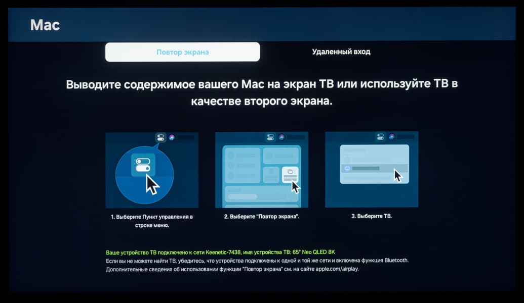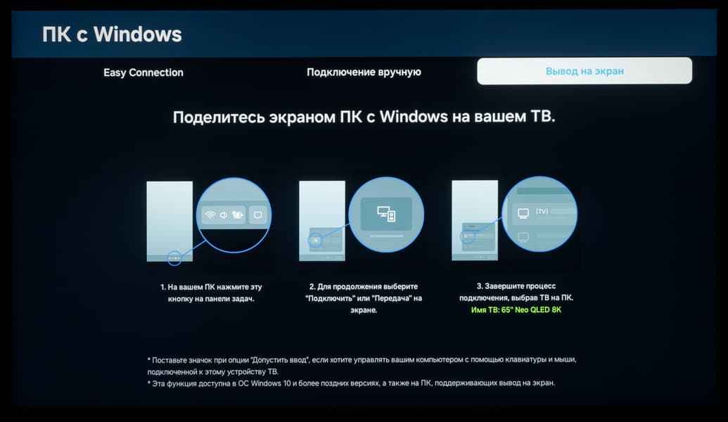 Телевизор Samsung предлагает подключение к системам на базе Windows и MacOS. Возможно использование встроенной функции Wi-Fi Direct для передачи копии экрана мобильного устройства и звука. В случае достаточно производительного устройства (в нашем случае это был Poco F5) можно получить удовлетворительный по качеству вывод видео, но с уровнем fps не выше 30, вполне ощутимой задержкой вывода и явным сжатием видеопотока.
