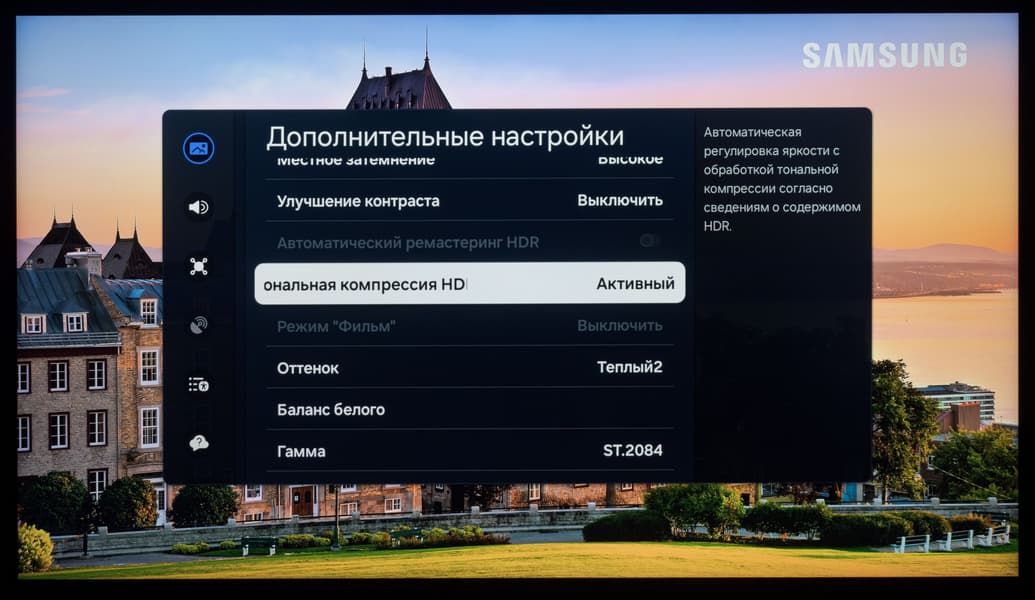 Можно отметить относительно плавное уменьшение яркости при отклонении от перпендикуляра к экрану во всех трех направлениях в относительно широком диапазоне углов, но с несколько более быстрым и резким высветлением глубоких темных участков изображения, чем на IPS. При этом полноценный эффект Black-Crush у модели отсутствует, матрица показывает себя с самой лучшей стороны, в том числе, возможно, из-за резко сниженного в сравнении с другими *VA статичным коэффициентом контрастности. Напомним, здесь он 2500:1 в среднем против заявленных производителем 2000:1, что само по себе — смелое заявление для Samsung. Заявить подобное для своего премиального ТВ отважится не каждый производитель.
