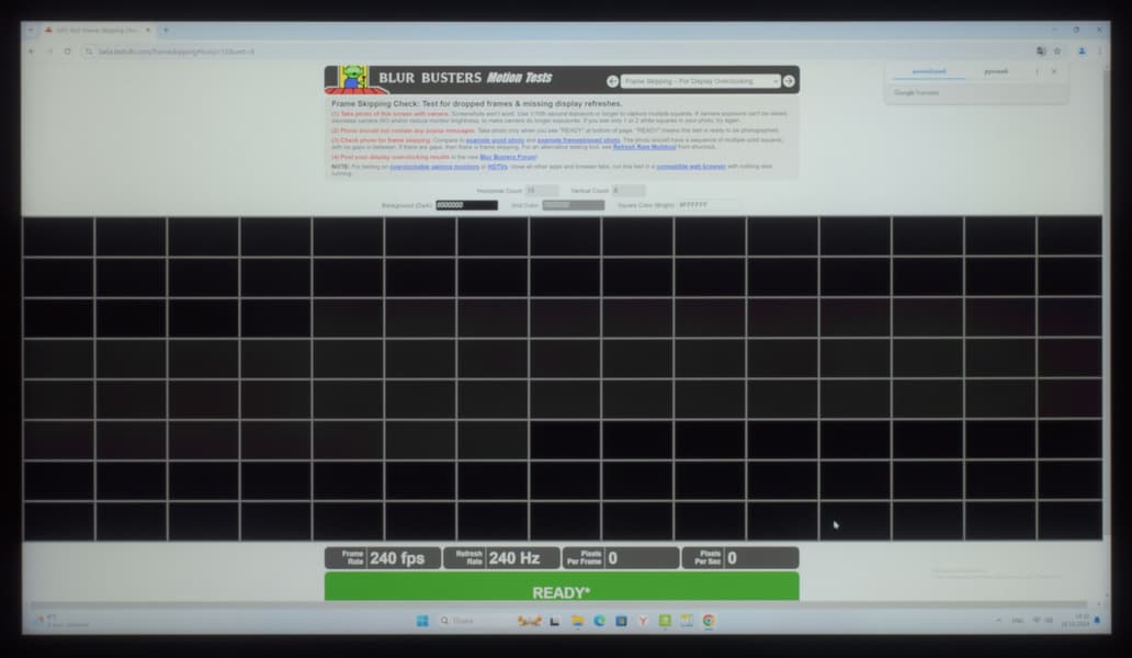 Тестирование на пропуск кадров мы провели при подключении ТВ к ПК. Использовался классический тест из набора TestUFO. Здесь можно отметить, что на частоте 240 Гц у Samsung QLED 8K QN900D проблем нет — пропуск кадров отсутствует.