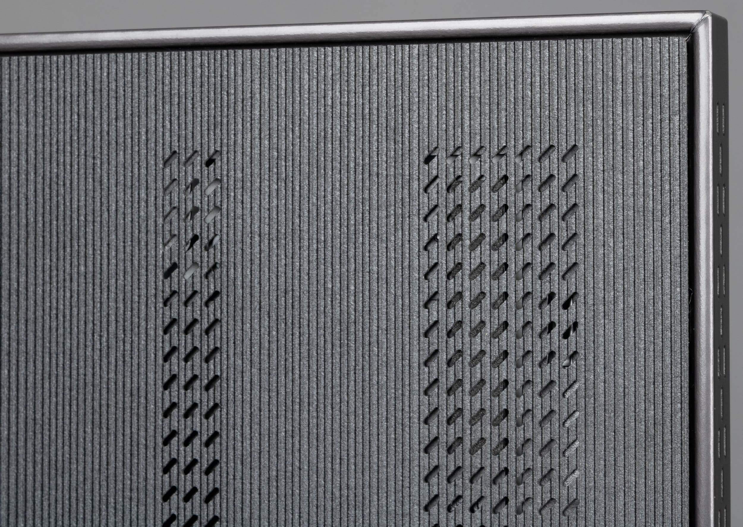 Дизайн рассматриваемого устройства строгий, декоративные элементы отсутствуют, в основном используется черный цвет («черный титан» в терминологии производителя). Телевизор выглядит аккуратно как спереди, так и сзади. Экран не имеет рамок — нет никаких накладных заметно выступающих вперед за плоскость элементов, есть только узкое обрамление из алюминиевого профиля. Этот профиль глубиной чуть больше 12 мм анодирован и окрашен в очень темный серый цвет.