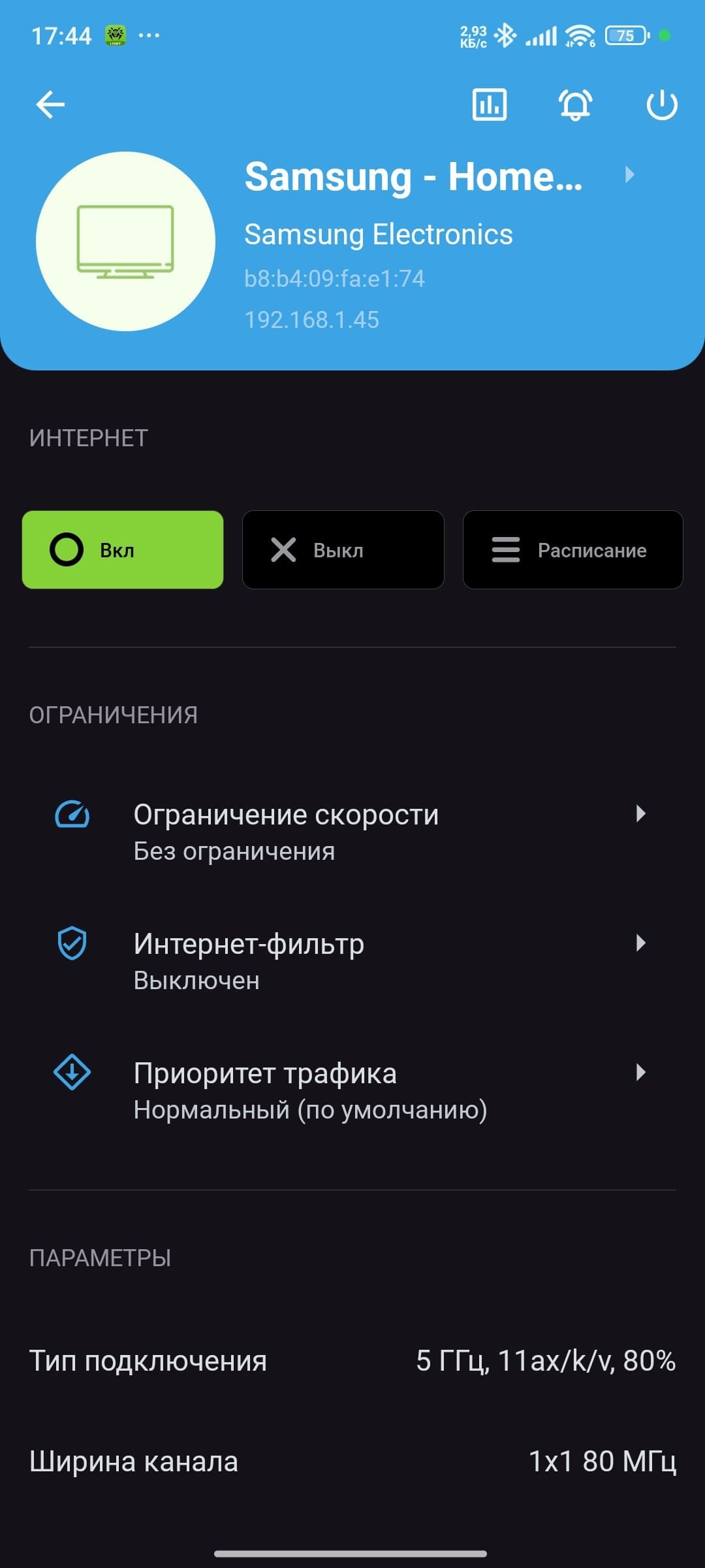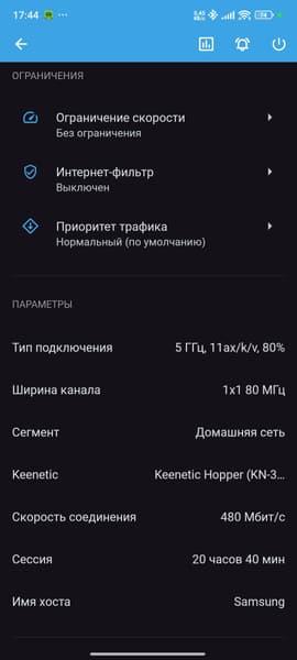 В развернутой сети 2,4/5 ГГц на базе роутера Keenetic Hopper (KN-3810), при нахождении телевизора в 5 метрах по прямой от него с преградой в виде монолитной стены, телевизор Samsung продемонстрировал стабильную скорость подключения в 480 Мбит/c (тип подключения — 11ax/k/r/v, 1×1 80 МГц), которая иногда поднималась до 540-578 Мбит/c в ходе периодических наблюдений.