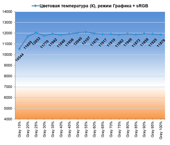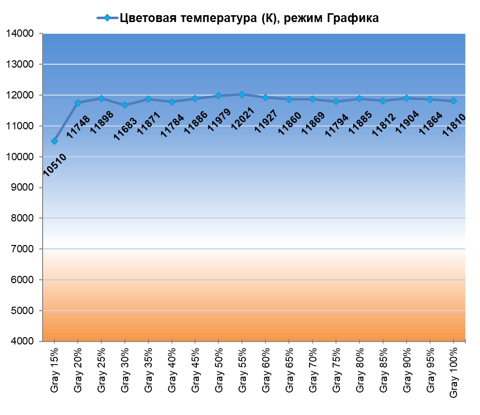 В вопросах же настройки цветовой температуры и баланса серого два изученных заводских режима практически не отличаются. Оба очень холодных, с резким перепадом ЦТ на темных участках. Настоятельно рекомендуем перейти в режим ЦТ «Теплый 2» либо провести ручную настройку устройства. В этом случае нам удалось сдвинуть все точки серого клина в нужную область, но проблемы со стабильностью ЦТ никуда не исчезли — теперь они просто слегка другие.