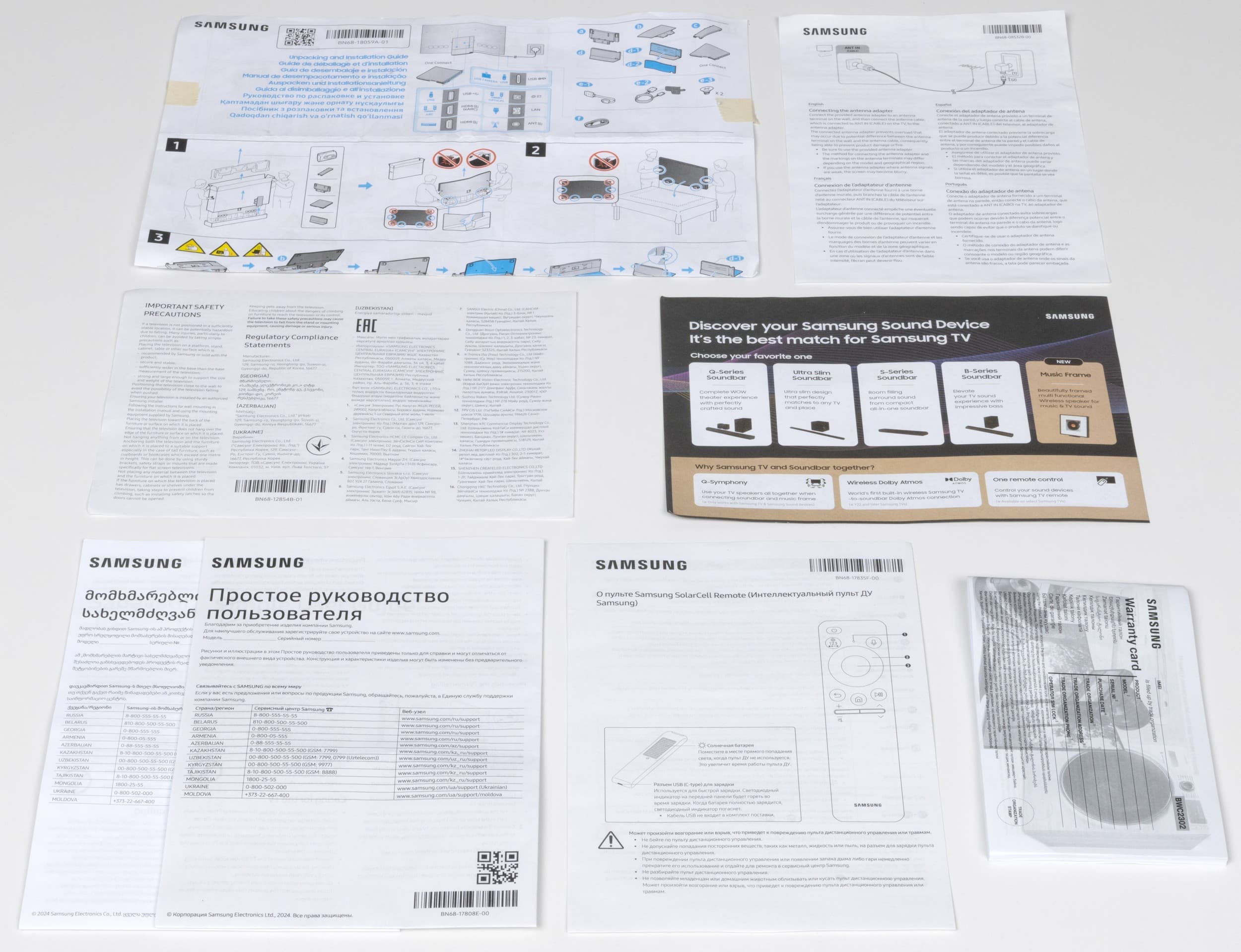 Из-за наличия внешнего коммутационного блока, в котором спрятана основная часть электронной начинки телевизора, комплект поставки оказался несколько расширен и дополнен большим количеством различной печатной продукции.