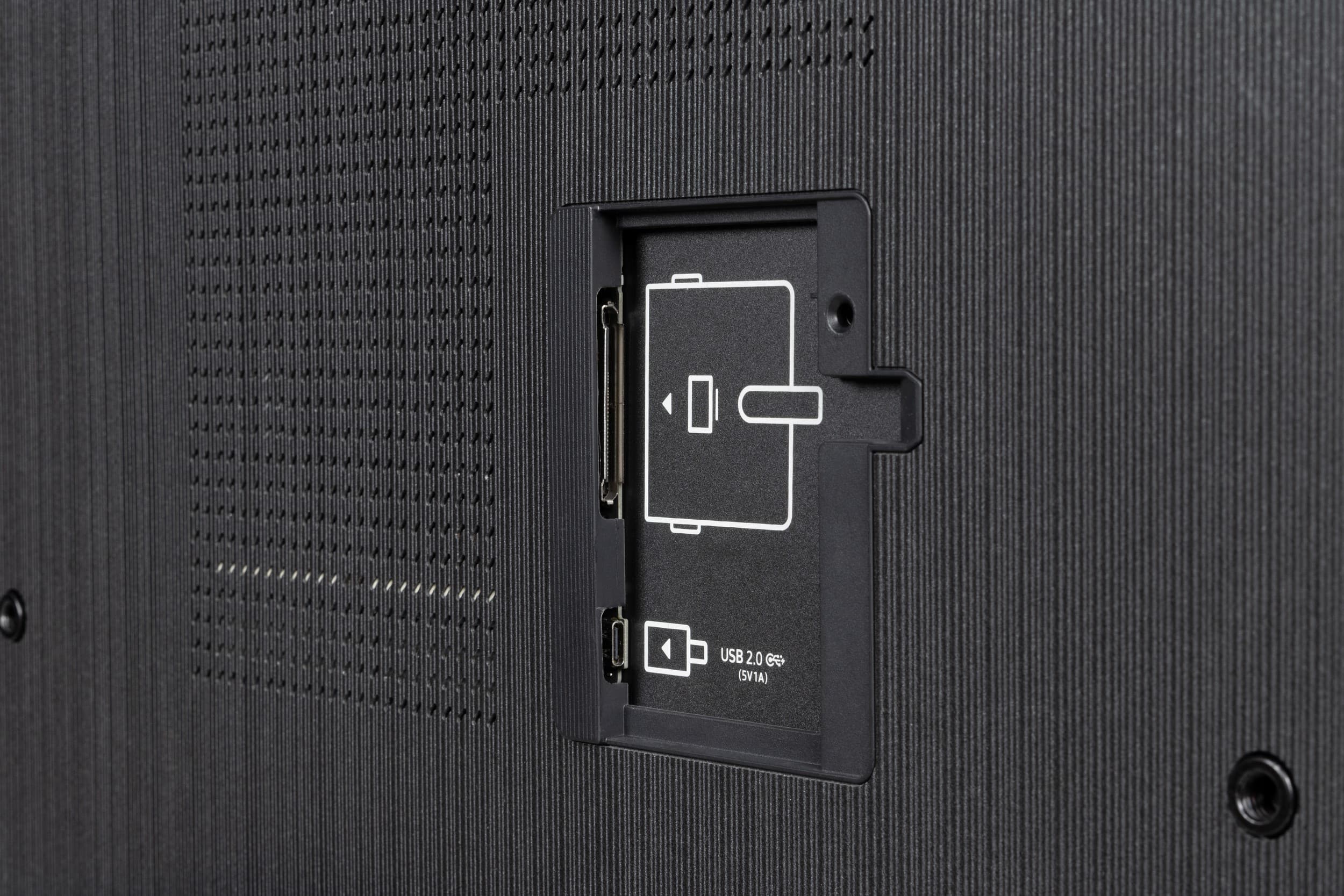 Разъем кабеля One Connect от соответствующего модуля One Connect Box устанавливается в гнездо в неглубокой нише на задней панели, а кабель от него может быть зафиксирован пластиковым прижимом из комплекта. Рядом есть разъем USB-C, который по версии производителя предназначен для подключения веб-камеры и сервисных случаев, но по факту работает как полнофункциональный третий порт USB.