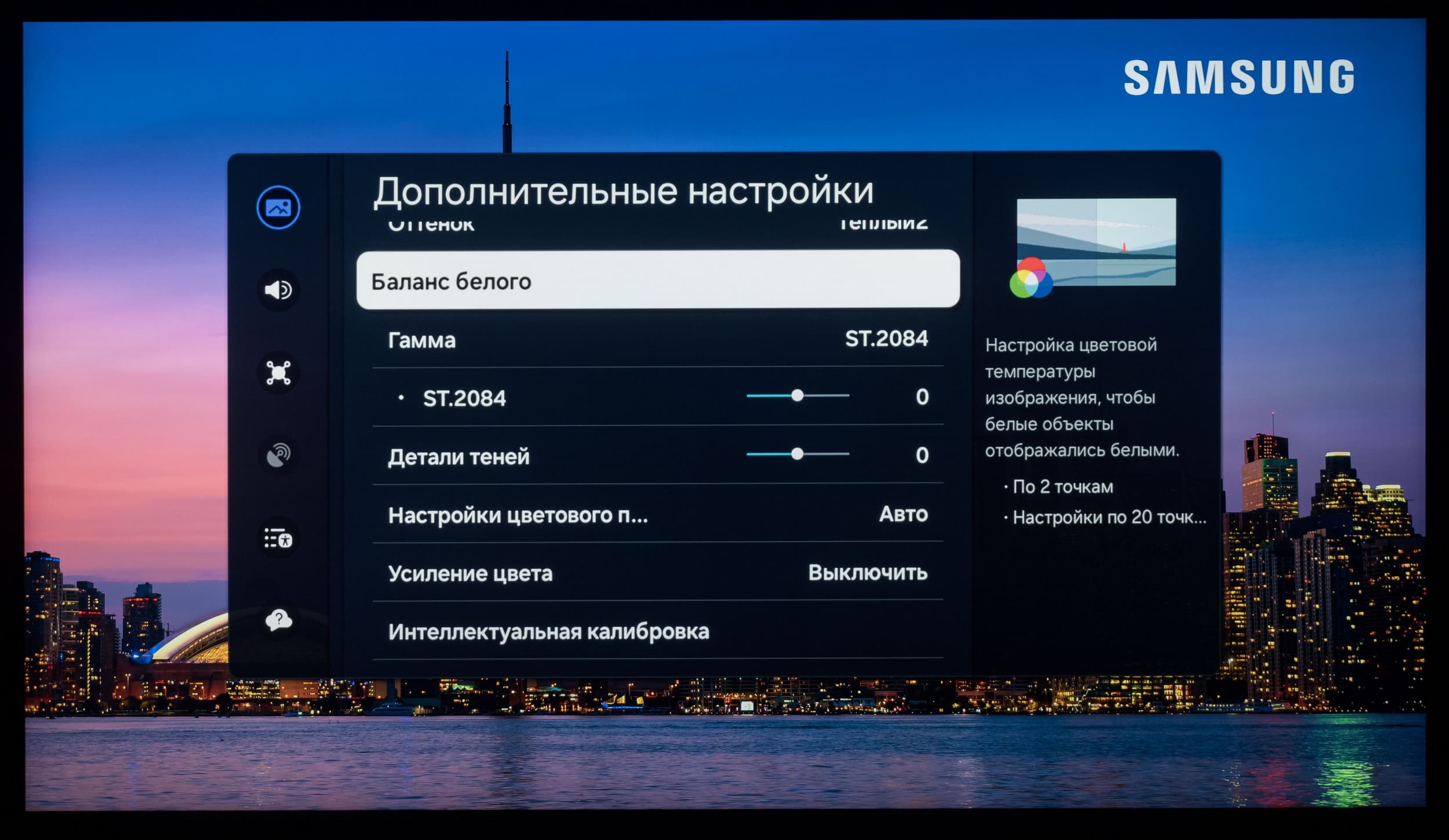 - Оттенок/Баланс белого: Теплый 2/ RGB — (−1/−13/−21)