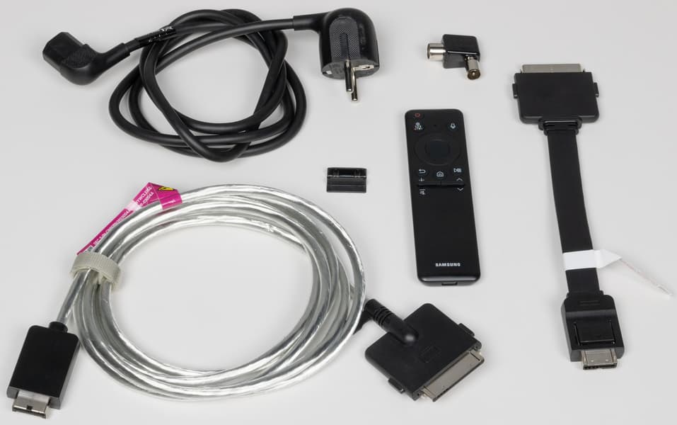 В нише на задней панели телевизора всего два разъема — сервисный разъем USB Type-C, который также может использоваться для подключения веб-камеры и широкий разъем для кабеля One Connect от одноименного модуля. От этого модуля на телевизор передаются как данные, так и питание, и всё это по одному кабелю. В комплекте поставки кабелей One Connect два с разной длиной — 0,3 м и 2,5 м.