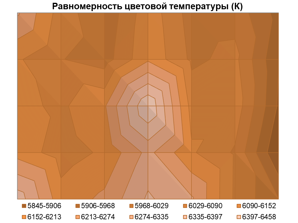 Результаты стабильности цветовой температуры не сильно хуже, снова учитывая размер экрана: среднее отклонение от центральной точки составило 5%, максимальное 9,5%, а вариация значений по полю экрана слегка превысила уровень в 600 К, что является результатом выше среднего. Чем дальше от центра, тем ниже цветовая температура и, соответственно, теплее картинка.