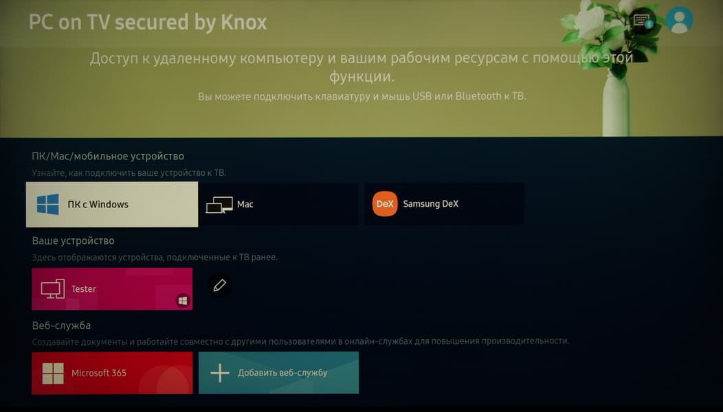 Нужно отметить, что в целом интерфейс хорошо оптимизирован для использования только комплектного пульта ДУ, то есть подключать клавиатуру и мышь, в общем-то, не обязательно, но они пригодятся еще в трех сетевых функциях: доступ к удаленному рабочему столу, подключение к мобильному устройству и работа в Office 365. Нами была подтверждена работоспособность доступа к удаленному рабочему столу (Remote Desktop Connection). В этом режиме плеер ТВ может воспроизводить мультимедийный контент из доступных общих папок ПК. Режим Samsung DeX и работу в Office 365 мы не проверяли.