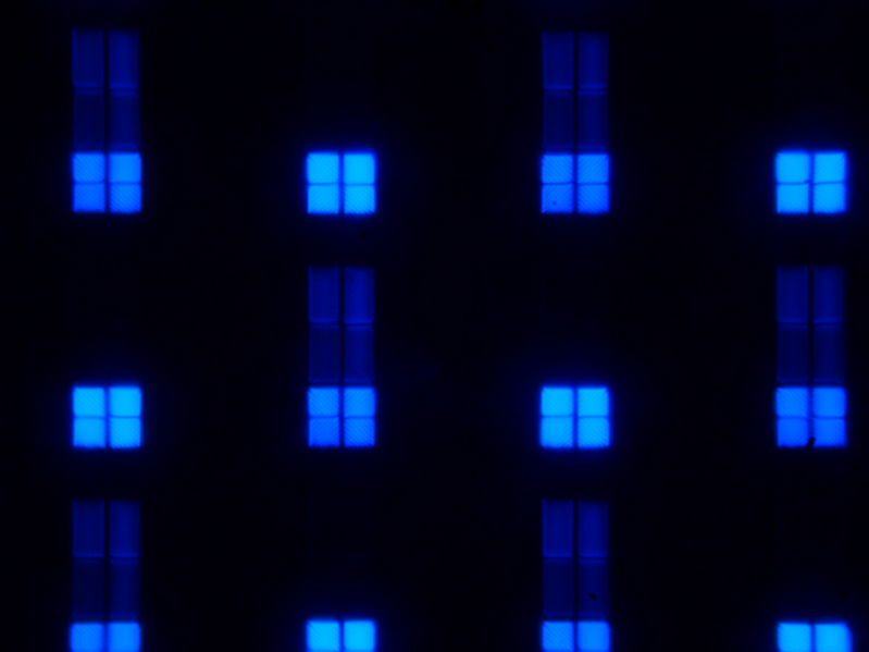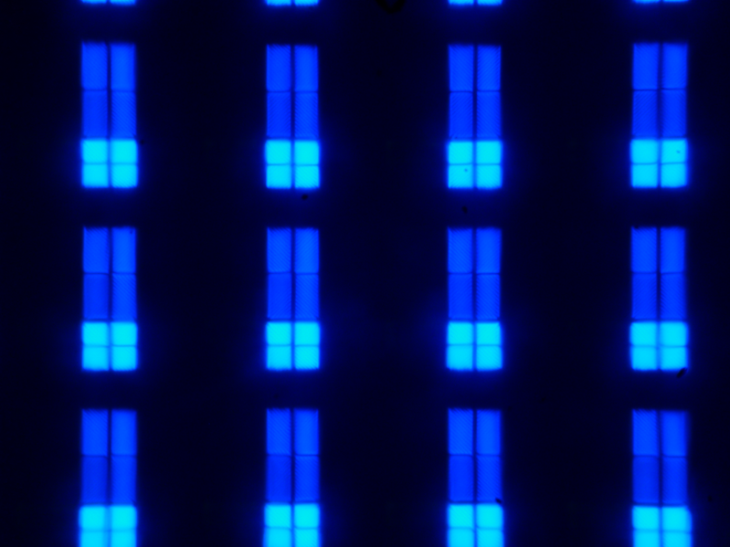 Масштабирование к разрешению матрицы ТВ (если оно нужно) выполняется с высоким качеством, без явных артефактов и без потери контраста тонких линий. В случае сигнала 4К с исходной цветовой четкостью (вывод в режиме RGB или компонентного сигнала с кодированием цвета 4:4:4) и при 60, 59 (59,94?), 30 и 29 (29,97002616?) кадр/с, вывод собственно изображения на экран ТВ осуществляется без снижения цветовой четкости (если для имени источника выбрано значение PC или ПК), но не доступны некоторые настройки изображения, выбор цветового охвата в частности. При таком же разрешении, но при других условиях есть небольшое снижение цветовой четкости по горизонтали, а полутона выводятся с чередованием яркости пикселей. Ниже приведены микрофотографии, полученные при выводе полутонов: