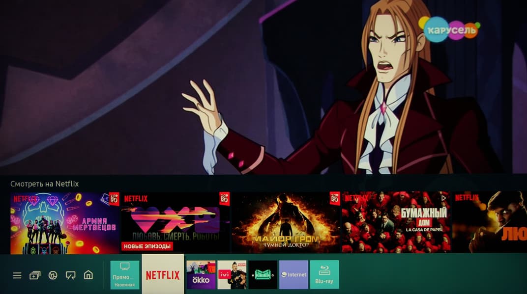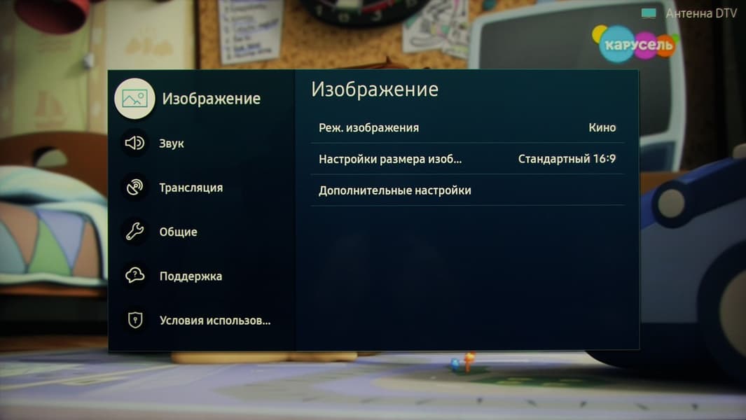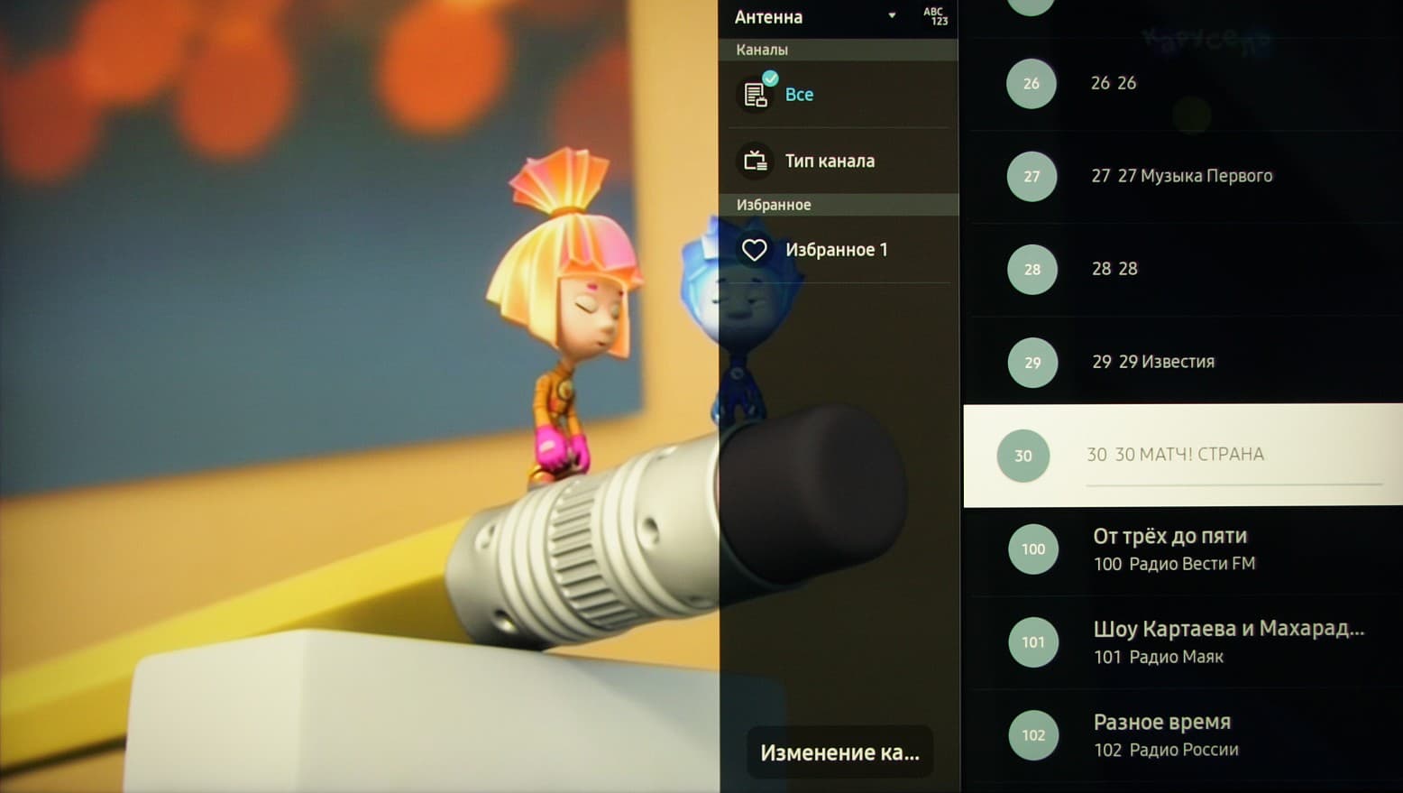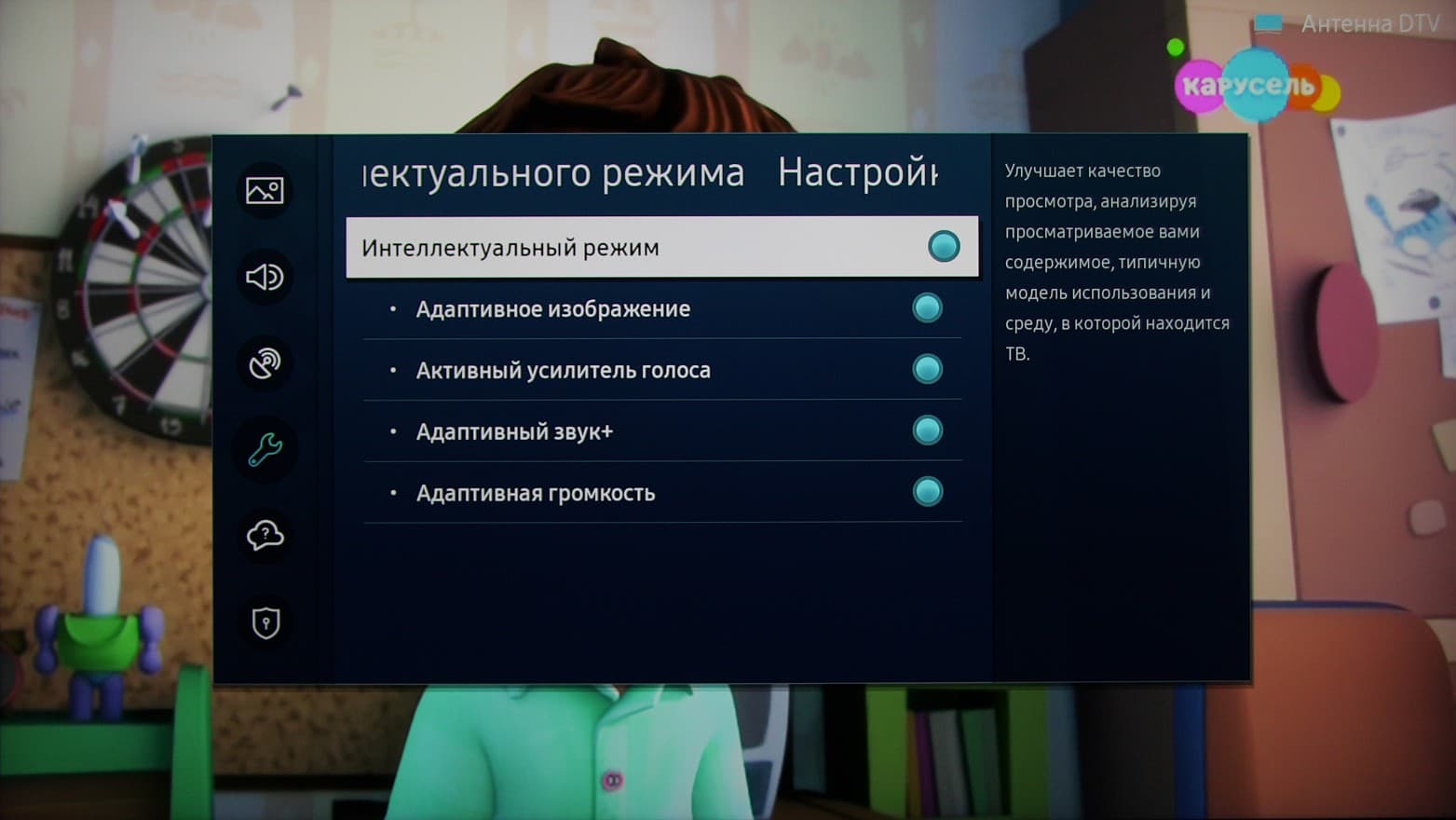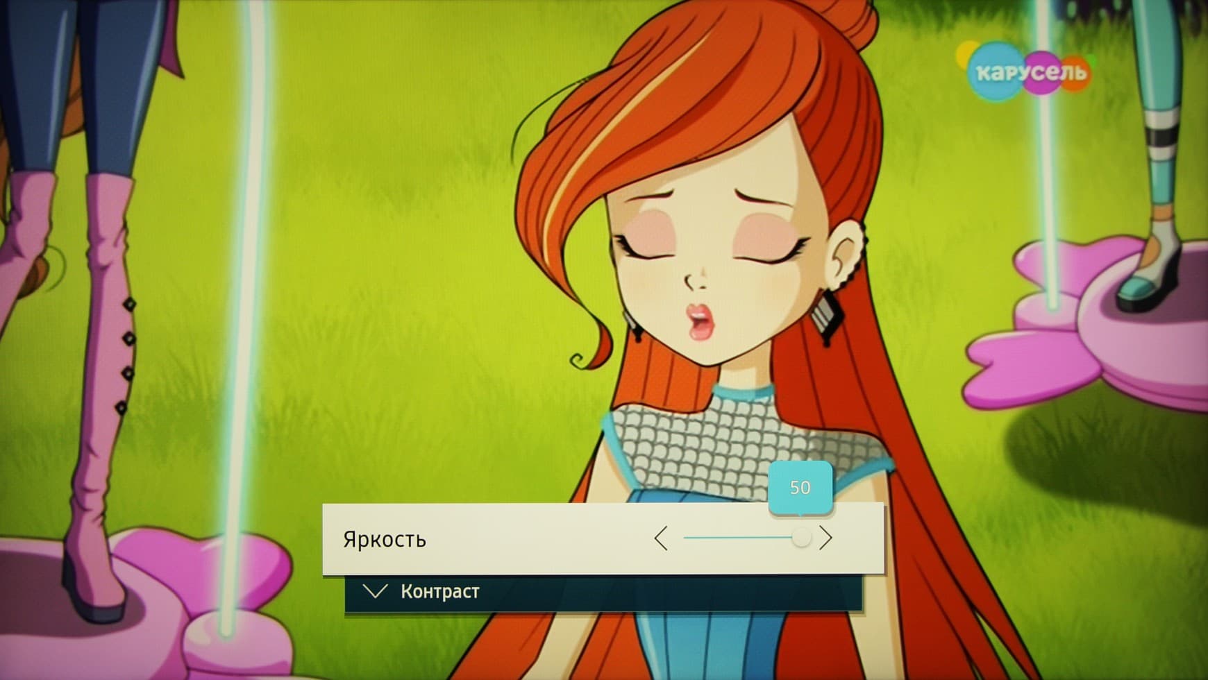 Отметим, что в целом ни к стабильности работы, ни к отзывчивости оболочки у нас никаких претензий не возникло. На команды с пульта ТВ реагирует почти моментально. Несмотря на разнообразную анимацию и звуковые эффекты, навигация по меню быстрая. Правда, нет кнопки быстрого доступа к настройкам, а возврат из меню с настройками к текущему просмотру выполняется через главный экран. Меню с настройками ТВ занимает большую часть экрана, надписи в нем читаемые.