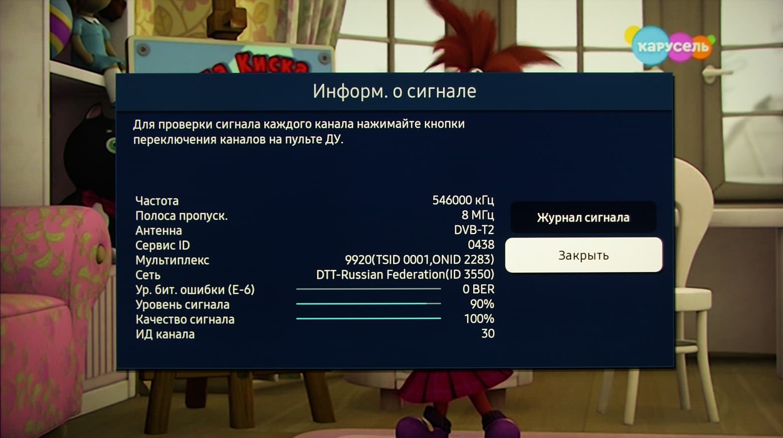 Данная модель, помимо спутникового тюнера, оснащена тюнером, принимающим аналоговый и цифровой сигнал эфирного и кабельного вещания. Качество приема цифровых каналов на дециметровую антенну, закрепленную на стене здания (почти прямая видимость в направлении на телевышку в Бутово, расположенную на расстоянии 14 км), было на высоком уровне — удалось найти ТВ-каналы во всех трех мультиплексах (всего 30, плюс 3 канала радио).