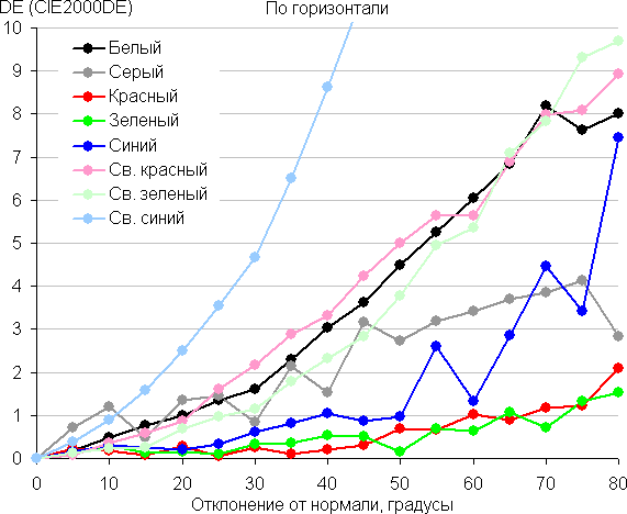 Для количественной характеристики изменения цветопередачи мы провели колориметрические измерения для белого, серого (127, 127, 127), красного, зеленого и синего, а также светло-красного, светло-зеленого и светло-синего полей во весь экран с использованием установки, подобной той, что применялась в предыдущем тесте. Измерения проводились в диапазоне углов от 0° (датчик направлен перпендикулярно к экрану) до 80° с шагом в 5°. Полученные значения интенсивностей были пересчитаны в отклонение ΔE относительно замера каждого поля при перпендикулярном положении датчика относительно экрана. Результаты представлены ниже: