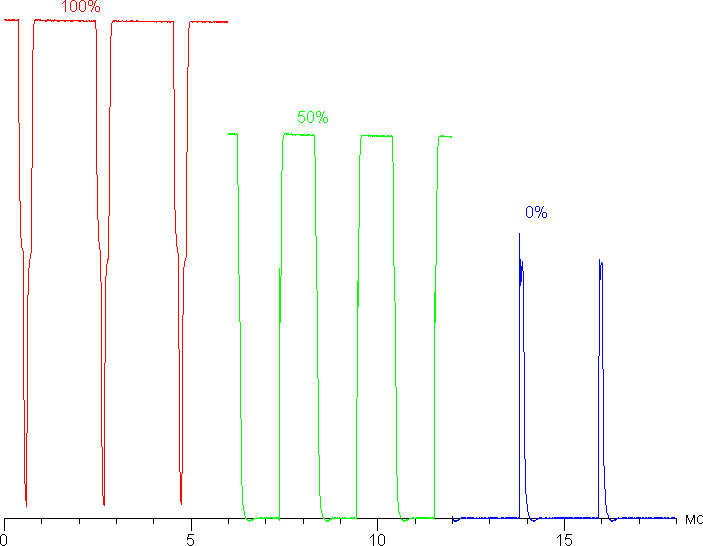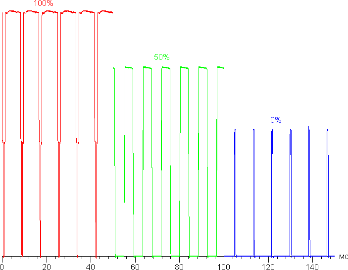 Управление яркостью подсветки осуществляется с помощью ШИМ с частотой 120 Гц. Ниже приведена зависимость яркости от времени, числа — это значения настройки Яркость: