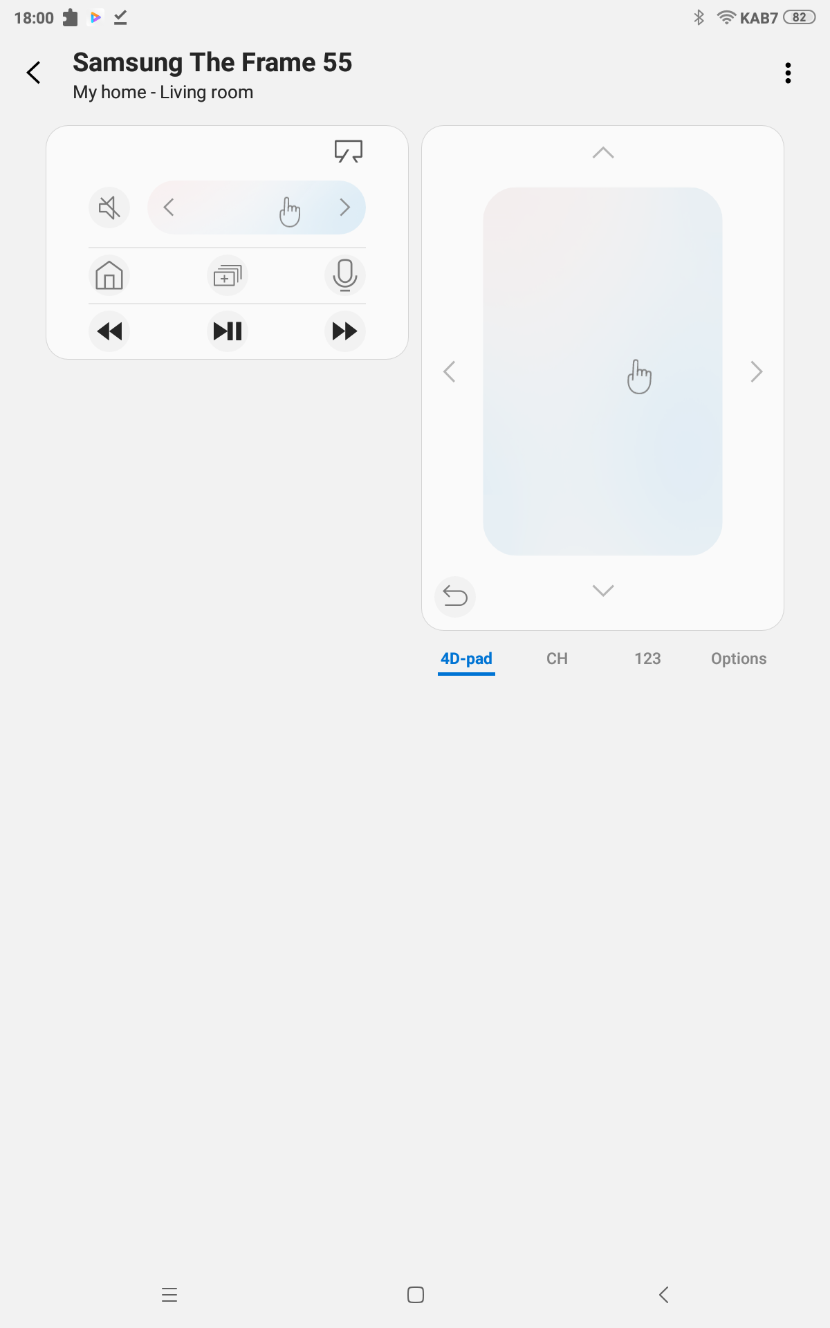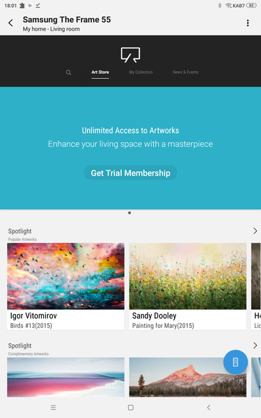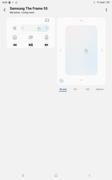 Телевизором можно управлять посредством мобильного устройства с помощью фирменного приложения SmartThings для Android и iOS. В данном ПО телевизор представляется как одним из устройств «умного дома», входящих в экосистему SmartThings. Для доступа к устройствам SmartThings используется облачный сервис, поэтому телевизором можно управлять из любого места, где есть доступ к Сети, хотя в данном случае это не дает особых преимуществ. В ПО SmartThings в главном окне модуля работы с телевизором есть виртуальный пульт ДУ с кнопками и панелью координатного ввода, панель выбора входов и приложений. Дополнительно с помощью SmartThings можно настраивать работу режимов Ambient и «Картина» (Art Mode).
