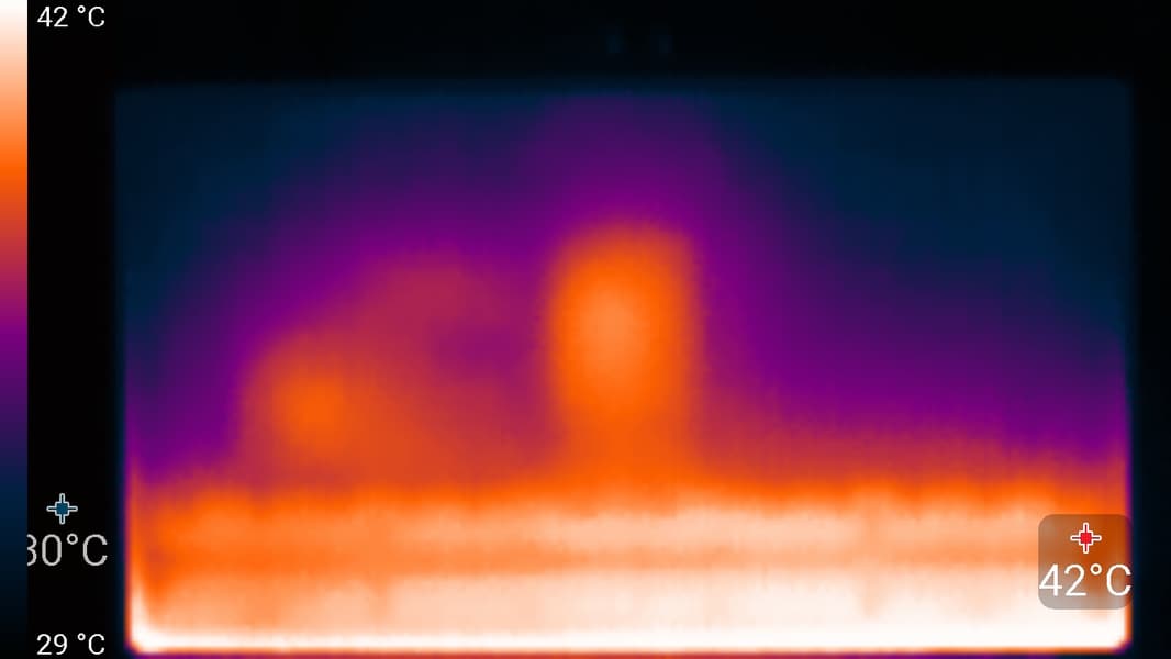 Нагрев телевизора можно оценить по приведенному снимку с ИК-камеры, полученному после долговременной работы на максимальной яркости в помещении с температурой примерно 24 °C: