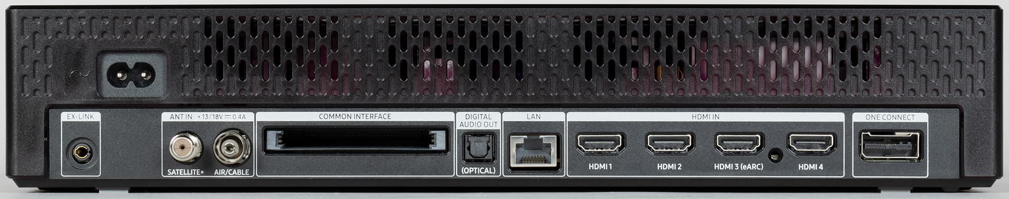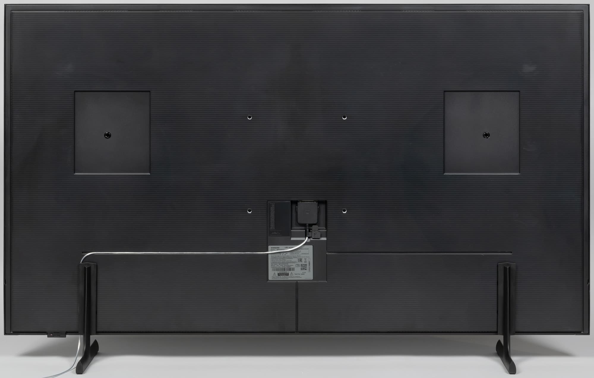 Разъем кабеля One Invisible Connection от модуля One Connect устанавливается в гнездо в неглубокой нише на задней панели, а кабель от него фиксируется пластиковым прижимом.