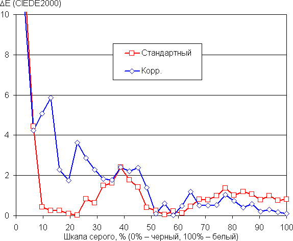 Графики ниже показывают цветовую температуру на различных участках шкалы серого и отклонение от спектра абсолютно черного тела (параметр ΔE) при выборе варианта Стандартный (максимальная яркость и контрастность) для настройки Оттенок и после небольшой коррекции цветового баланса настройками усиления трех основных цветов (значения 0, −17 и −10 для усиления красного, зеленого и синего цветов после выбора варианта Теплый2):