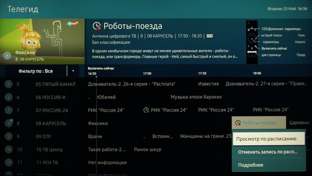 Отметим, что при настройках по умолчанию телевизор отлично обрабатывает и масштабирует изображение, поэтому даже картинка в исходном стандартном разрешении на этом большом экране смотрится хорошо. Присутствуют списки любимых каналов. Есть хорошая поддержка электронной программы передач (если она передается) — можно посмотреть, что именно идет на текущем и других каналах, запрограммировать просмотр или запись программы или сериала и т. д.
